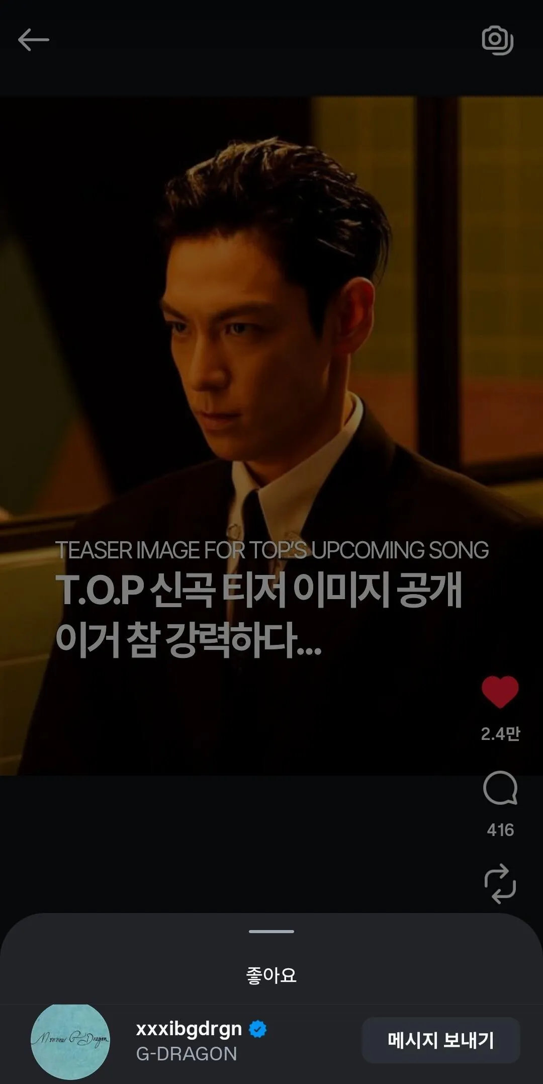 权志龙太阳点赞TOP回归帖子 网友发现权志龙、太阳点赞了T.O.P回归相关的帖子