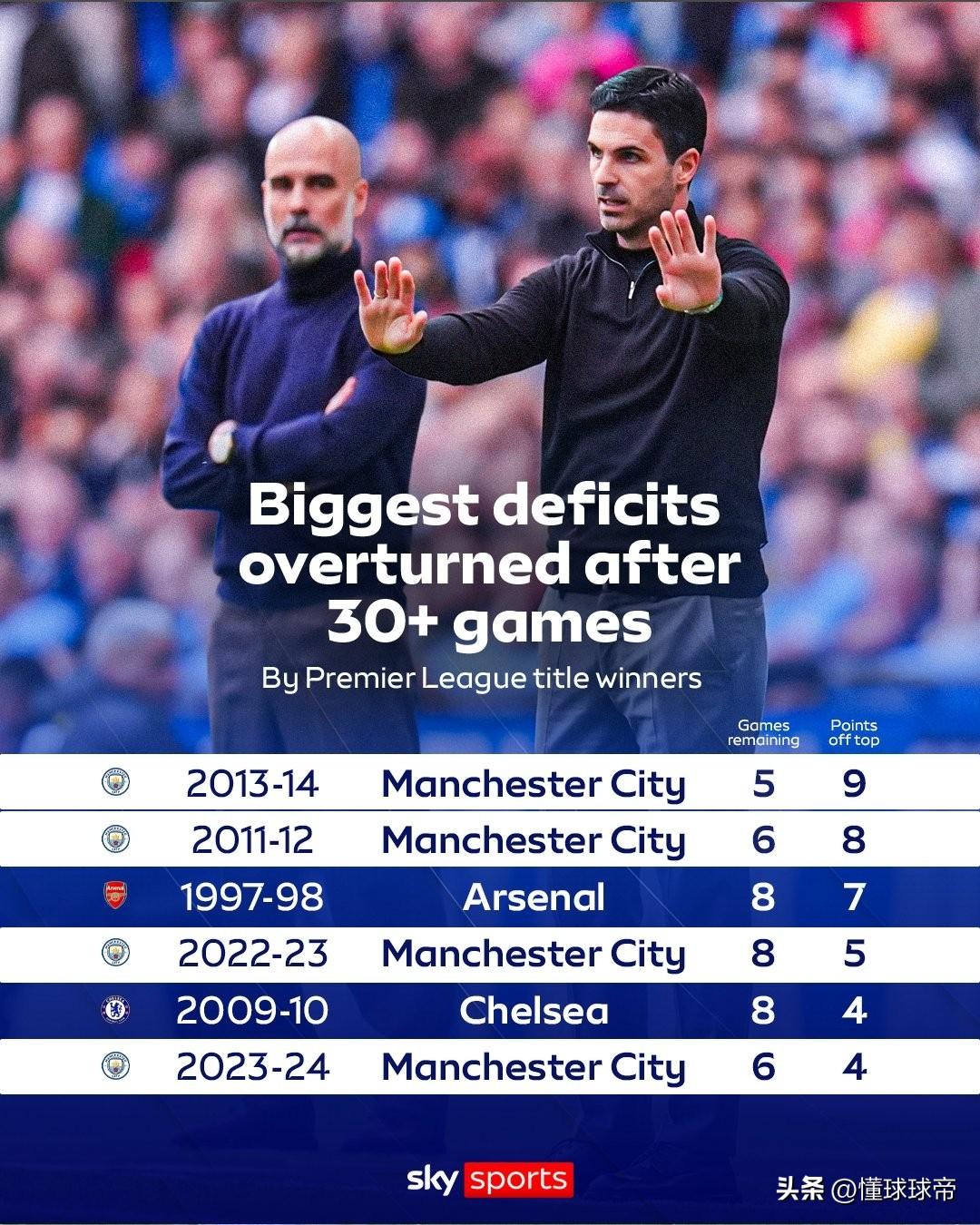 阿森纳已经瑟瑟发抖了,历史证明曼城最终要逆转阿森纳拿走英超冠军了! 本赛季英超已经踢了31轮,曼城少赛一场落后阿森纳9分(其实也就相当于6份),这个积分差距看似很大,但是在瓜迪奥拉面前真不够看,瓜迪奥拉完全有信心在剩余的7轮英超联赛中逆转阿森纳拿走英超冠军了。 首先,瓜迪奥拉执教生涯至今从未连续两个赛季无缘联赛冠军,执教一线队16个赛季以来,瓜迪奥拉只在11/12、16/17、19/20和24/25赛季没有拿到联赛冠军了,由此可见只要瓜迪奥拉这个赛季没有拿到联赛冠军,下个赛季绝对会重新夺回来。 其次在13/14赛季,曼城在英超剩余5轮联赛时还落后利物浦9分,但是最终却反超2分拿到了英超冠军,因此现在还有7轮联赛落后6分根本不算事。 因此曼城占据了天时地利人和,完全有信心逆转阿森纳了,反而阿森纳现在却人心惶惶,联赛杯输给曼城丢掉冠军可以说打击太大了,有可能让阿森纳彻底崩盘了。