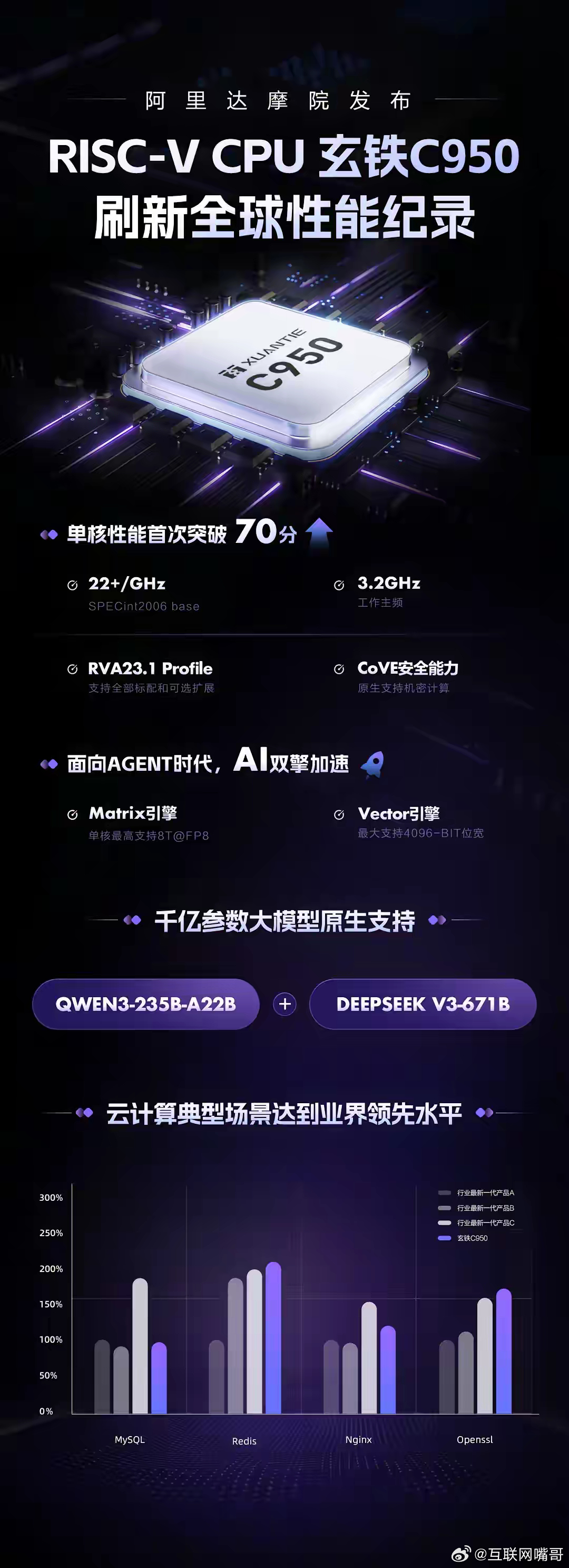 英特尔、AMD刚发出“警告”,阿里达摩院就扔出一个重磅炸弹,风向彻底变了!在2026年摩根士丹利科技、媒体和电信大会上,英特尔、AMD均公开表示,受AI产业的影响,CPU需求正在快速提升。AMD首席执行官说:CPU需求增长很显著,这主要是由于推理需求的上升。有意思的是,英特尔、AMD前脚刚发出“警告”,后脚阿里达摩院就宣布在RISC-V CPU领域取得了重大突破。在2026玄铁RISC-V生态大会上,阿里达摩院发布了新一代高性能处理器玄铁C950。这个玄铁C950可不简单,一经发布就刷新了RISC-V的性能记录,拿下了全球最高评分,成为了全球最强RISC-V CPU。当然,这还不算是重点,最重要的是这一次发布的玄铁C950绝对是最符合AI时代芯片要求的处理器。因为RISC-V作为开源架构,天然的具有开放性和灵活性的特点,和AI的契合度是最高的。达摩院玄铁还发布了Vector与Matrix两大AI加速引擎,赋予CPU原生的AI能力,玄铁C950搭载Matrix加速引擎以后,可以顺利运行Qwen3-235B-A22B和DeepSeek V3-671B“满血版”。说起来这还是开CPU原生支持千亿参数大模型。不得不说,未来必定是AI的天下,全球都在疯抢CPU、GPU的需求。而RISC-V是一条崭新的,甚至是AI时代最优选择,阿里或将成为最大的“赢家”,期待更多中国企业继续勇攀高峰,带来更多惊喜的消息!