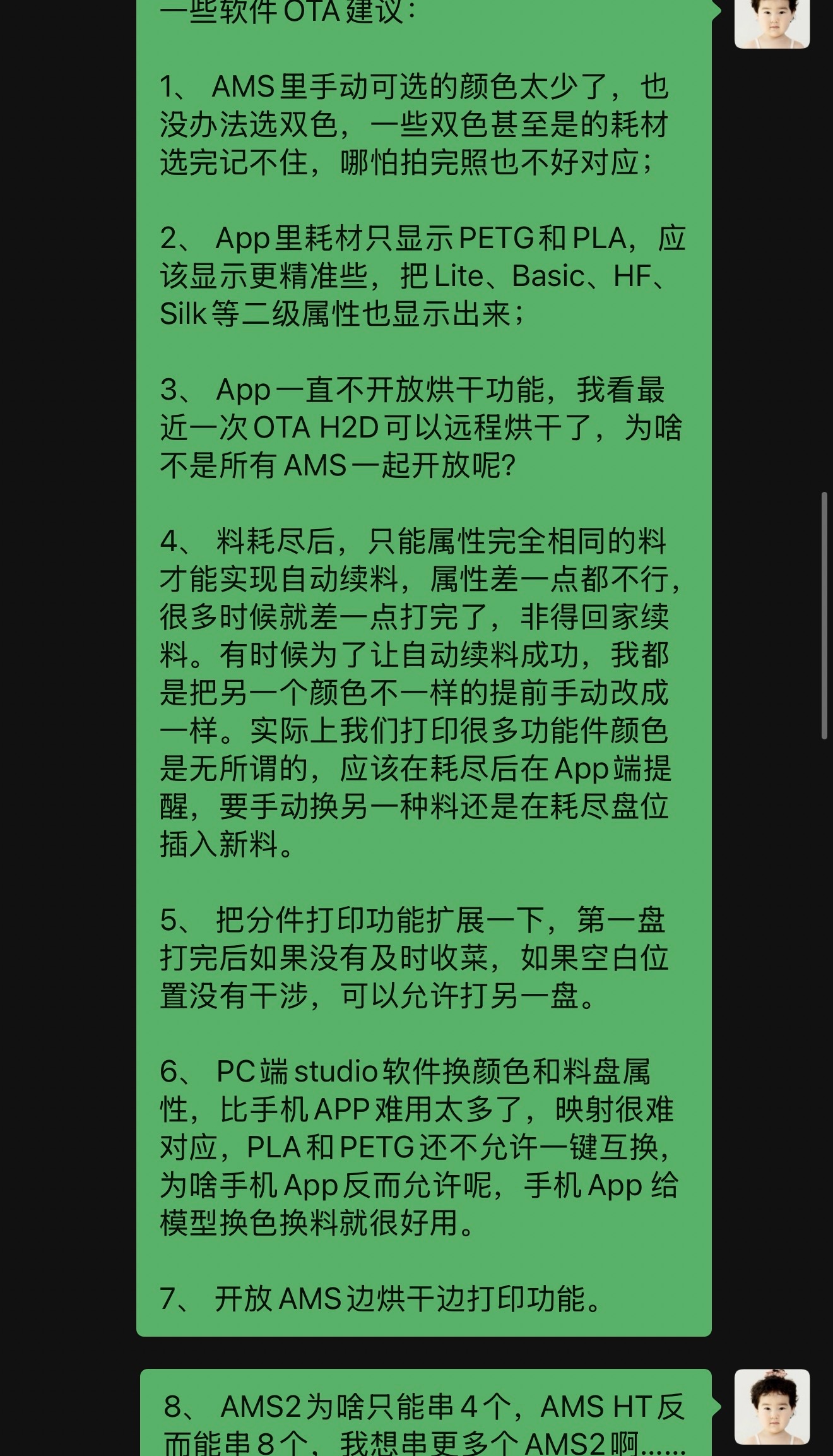 这波OTA很给力,终于支持边烘干边打印了。我发给拓竹一堆OTA建议,不知道啥时候能安排上。