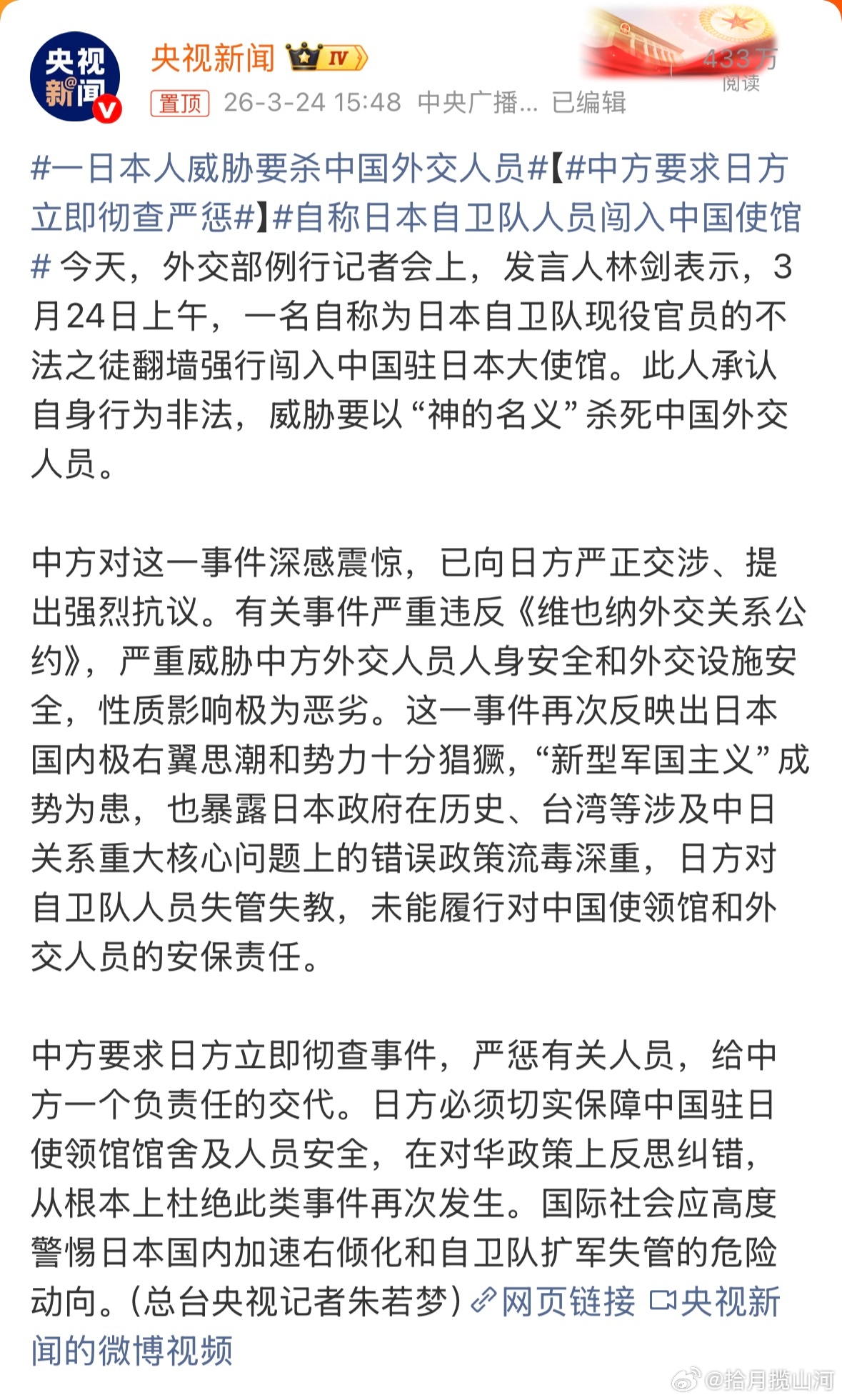 连环套啊这是,自称自卫队人员擅闯使馆,扬言要杀我外交人员,现在又准备降级中日关系