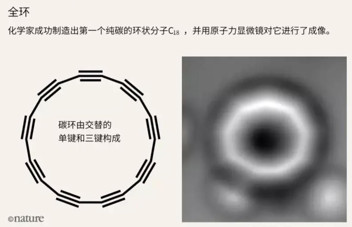 新型碳单质——环[18]碳 碳是一个神奇的元素,它的单质以金刚石和石墨最为人所熟知。碳的同素异形体从颜色、形状到硬度都有完全不同的性质。例如,当每个碳原子都连着3个相邻的碳原子时,它是相对柔软的石墨、石墨烯、碳纳米管和富勒烯;当每个碳原子都有4个相邻的碳原子时,它是坚硬的钻石。 这些都是已经得到充分研究的碳的形式,但还有一些形式不太为人所知,例如每个碳原子只有两个相邻碳原子相连形成的环碳,就非常难以捉摸。康奈尔大学的Roald Hoffmann 早在上世纪就提出:纯碳链若能弯曲成环, 交替出现三键与单键的构型将赋予材料半导体属性。遗憾的是,每一次尝试都被“环太活泼、一弯就断”的现实打回原形。50年来,这种环碳的结构一直是未知的,科学家探讨了两种可能性,一种是环中的键都有相同的长度,即都是双键;另一种是环中长键和短键交替分布,即三键和单键交替。但是由于它们的高反应活性,以至于研究人员很难在实际操作中将它们分离出来。之前有科学家曾制造出过一个碳环,但它们是气态的,很快就会消散。 2019年,由IBM和牛津大学的联合团队通过环丁酮结构的数个位点进行电化学脱羰基反应首次合成。它的合成轰动了学界,相关论文发表在顶级期刊《Science》上,并勇夺当期封面,美国化学会《C&EN》也将它评选的2019年度“明星分子”之一。环[18]碳是碳的同素异形体之一,由十八个碳原子以单叁键交替构成环。 理论上,环[18]碳是满足热力学稳定条件的最小环[n]碳,理论应变能为72 kcal/mol。但是2023年的11月,这个极限又被打破了——同济大学许维教授课题组报告了环[14]碳、环[10]碳两种新型碳分子形式的合成和表征,并发表在Nature上。 从“前体”到“裸环”的四步手术,揭示首次“抓到”碳-18的全过程: 1、先合成带氧原子的C₂₄O₆三角形前体 2、逐步“脱掉”四个碳原子,形成C₂₀O₂中间体 3、再脱去两个氧,得到C₁₈骨架 4、最后在高真空里用电流微操纵,一次性把最后一个氧赶走,留下18元环 整个过程像“拆炸弹”:每一步都必须在原子级精度下完成,稍有偏差,碳环就会塌陷成直线。 环[18]碳的单键与叁键交替结构可表现出良好的半导体特性,意味着环[18]碳可在纳米电子器件领域发挥重要的作用。