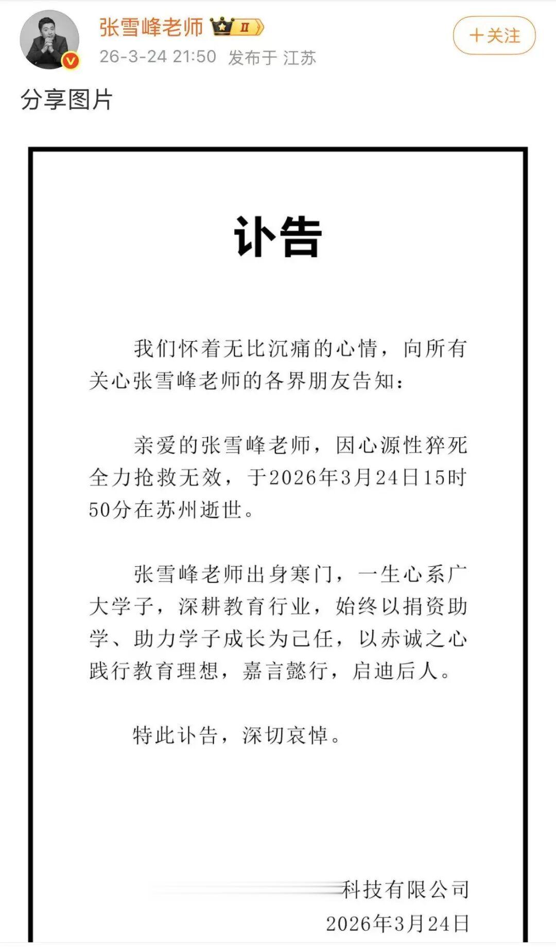 张雪峰因心源性猝死,抢救无效逝世