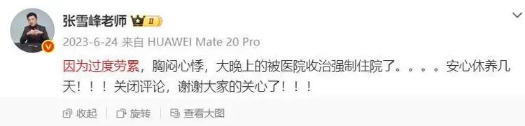 记者注意到,张雪峰此前曾因类似原因住院。2023年6月24日,他发布微博称:“因为过度劳累,胸闷心悸,大晚上的被医院收治强制住院了。安心休养几天!谢谢大家的关心了!”微博所配图片显示,他正在病床上。