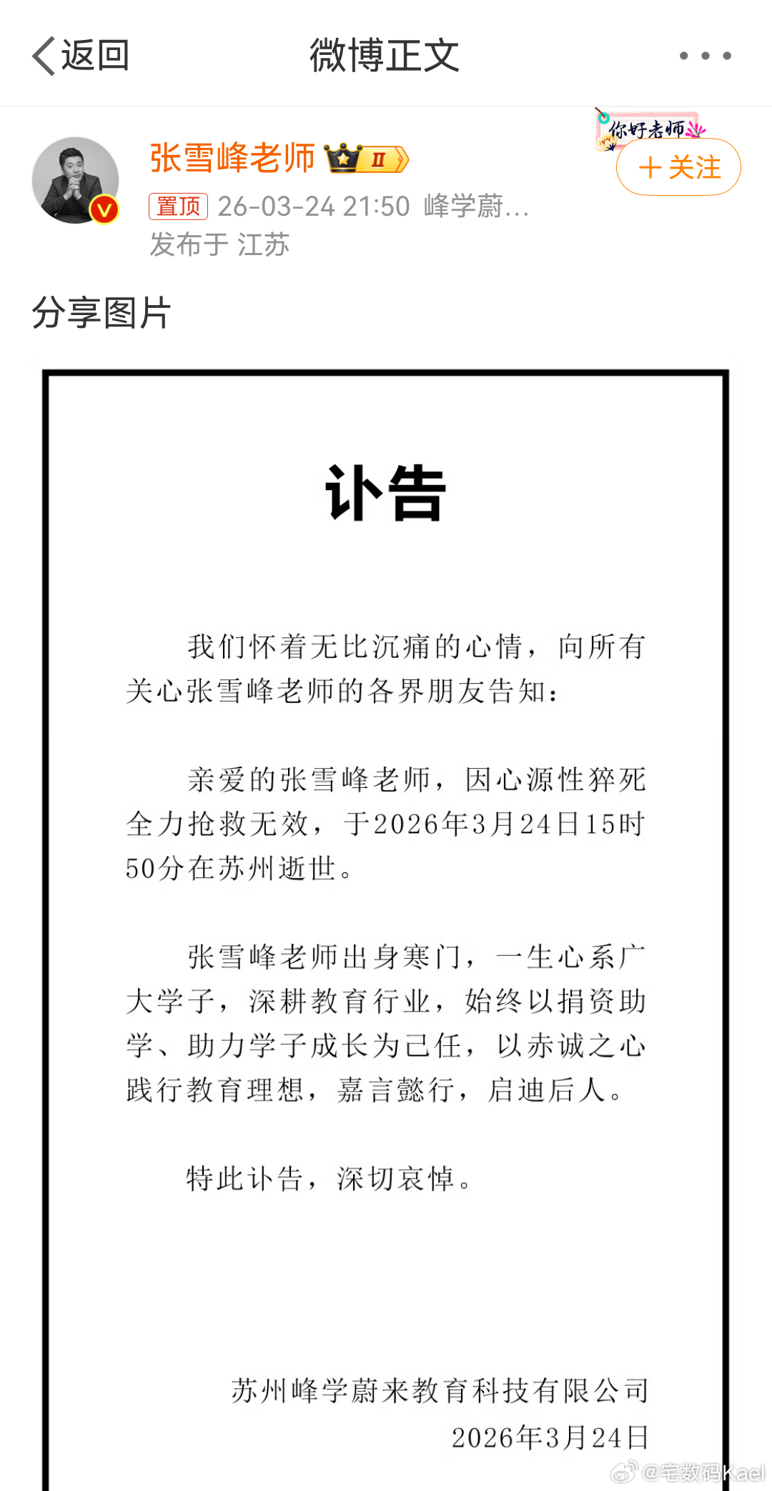 张雪峰公司发布讣告 我去,还真的去世了???太突然了,他年纪也不大啊,刚40出头
