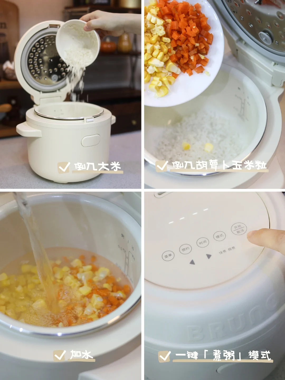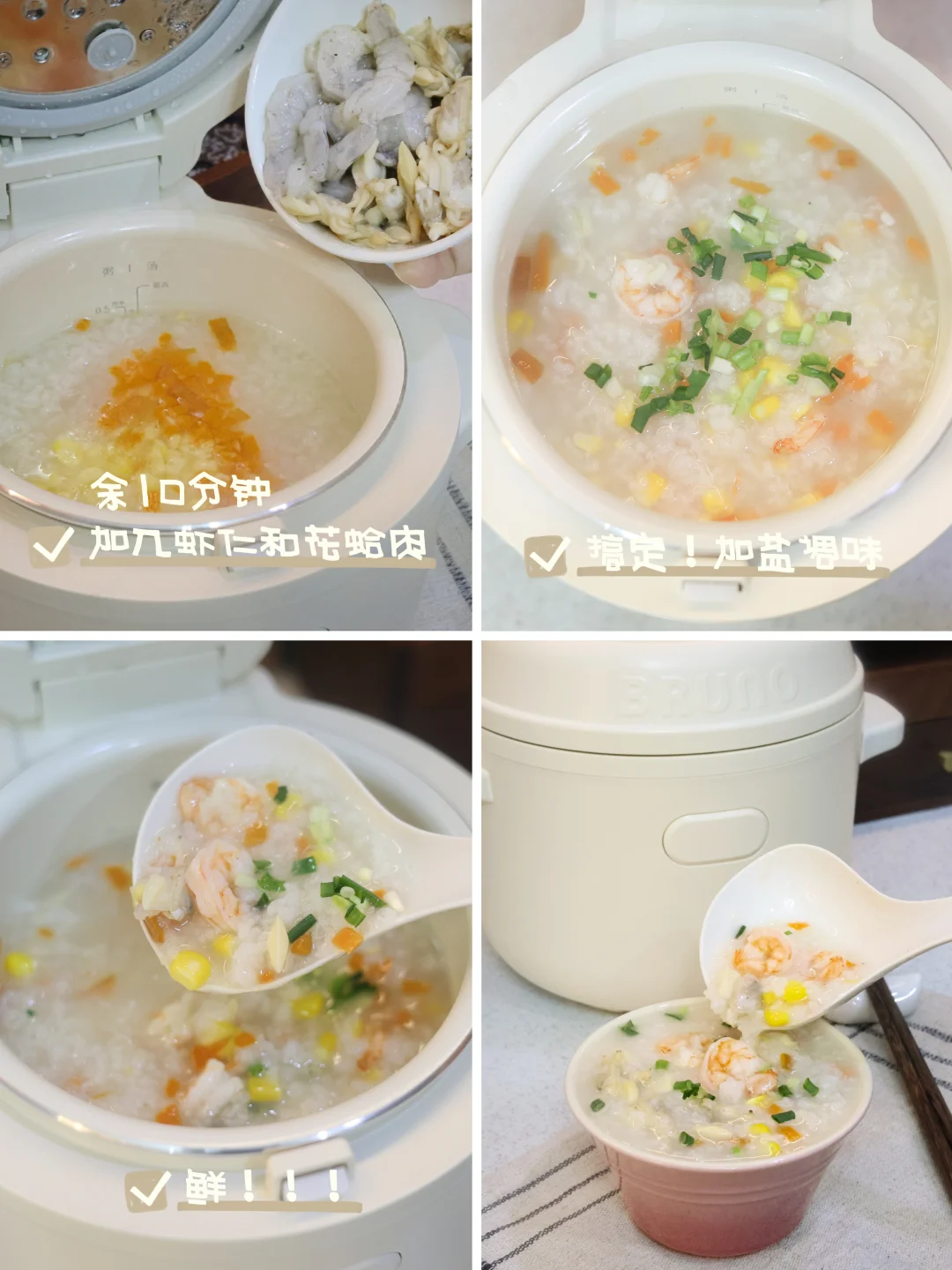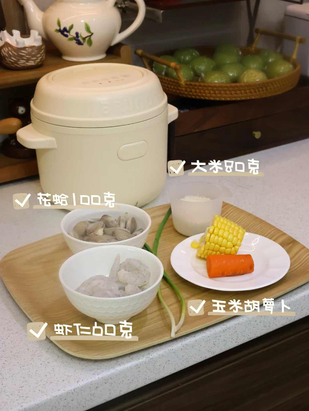 奶呼呼小饭墩!长得软萌可爱,一人食干饭太香了🍚 真的被这个小饭墩拿捏住了! 1.5L大小刚刚好,1-3人吃正合适,再也不剩饭,顿顿都新鲜! 厚釜内胆煮啥都香,煮粥绵密软糯,还不粘超好洗,能煮饭、煮粥、煲汤,蒸煮、预约、自动保温、懒人直接爱住✨ 用它煮了锅海鲜粥,鲜到🤲舔锅,做法超简单👇 📝食材准备: 虾仁60g、花蛤100g、大米80g、胡萝卜1小段、玉米20g、料酒1勺、盐、胡椒粉、葱花。 🔥做法: 1. 大米洗净放入小饭墩,倒入胡萝卜粒和玉米粒,加水开启“煮粥”模式。 ​ 2. 花蛤焯水后取出肉,虾仁和花蛤用料酒和少许胡椒粉腌制。 ​ 3. 煮到还剩10分钟时,倒入虾仁和花蛤肉。 ​ 4. 程序结束后加盐调味,撒上葱花,开吃! 一口下去,全是大海的味道!搭配小饭墩的完美口感,真的绝绝子!✨