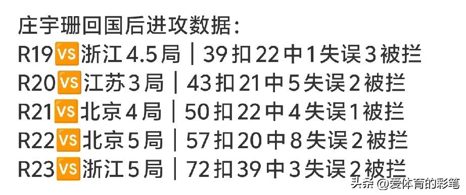 庄宇珊要累成牛马了[捂脸],与浙江女排的七八名排位赛首场,她72扣39中3拦,还接了16个一传,独砍42分的她几乎要赶上其她7人得分之和了,这是球队绝对的进攻核心啊[赞]。 回国后,她场场是进攻大拿,局局是得分利器,从开始的39扣暴增至72扣,扣球数量几乎翻了一倍,这能不让人心疼吗?希望福建女排省着点用,国家队赵勇教练还要指望健康的庄宇珊呢。庄羽珊意甲首秀