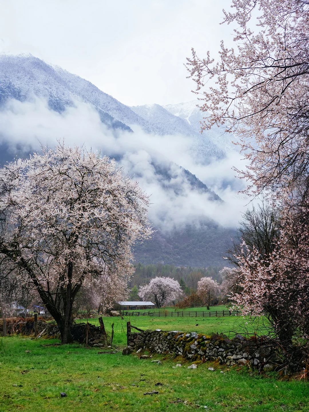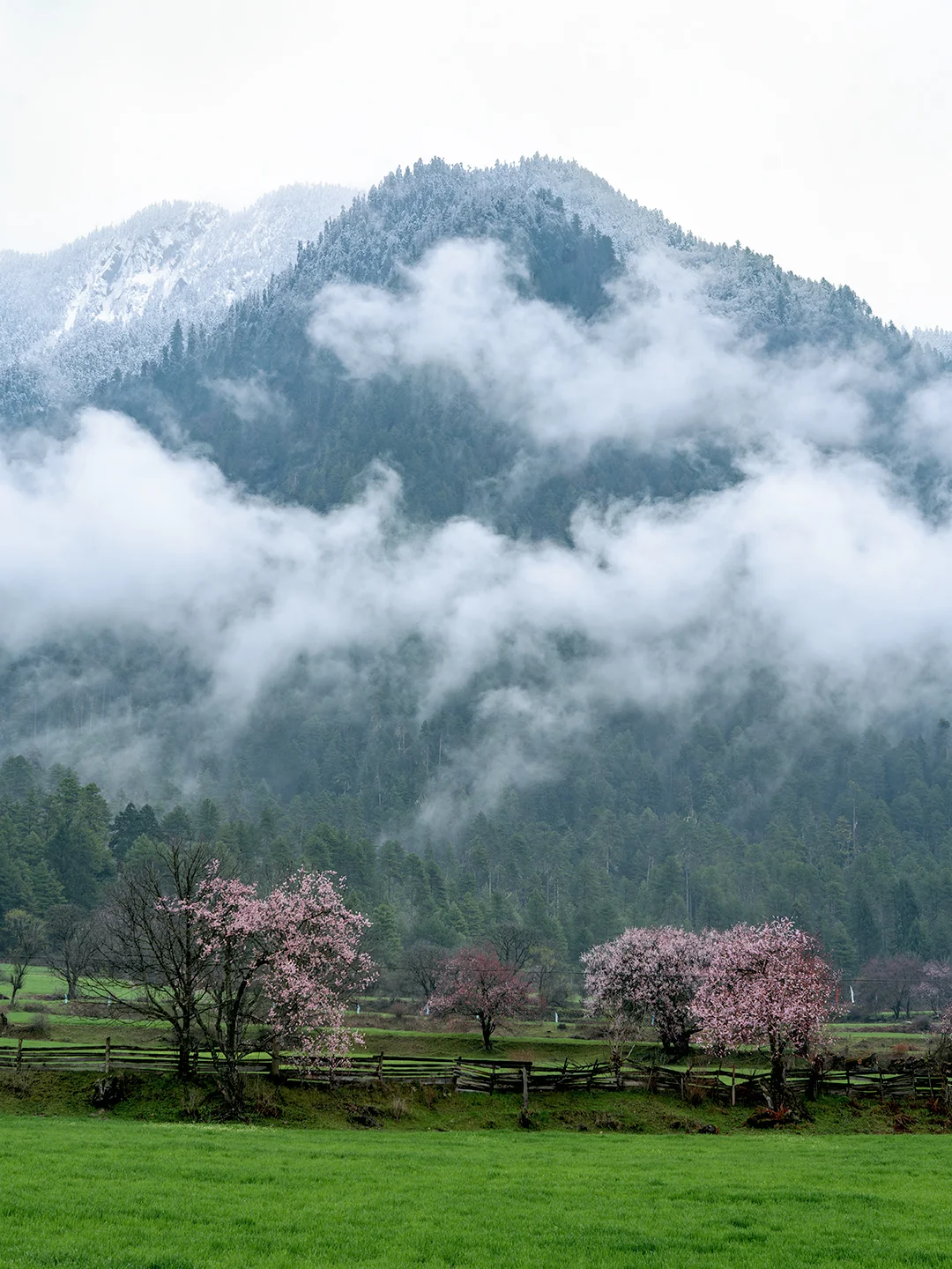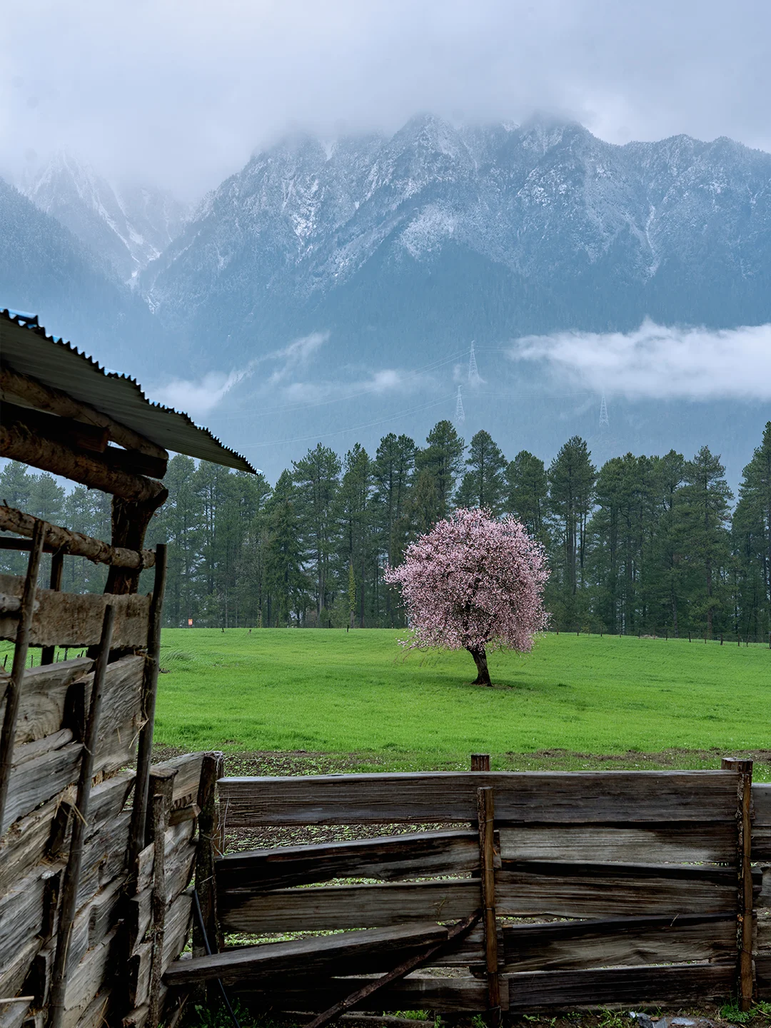 🧭导航:到岗美村方向,不进村,往岗云杉林方向开五分钟左右,会看到这个村子,继续往前还会有三四个绝美的小村落,没有游客,静谧清幽,大片的桃花,云雾缭绕的雪山,整片的草地,牛羊散落,绝对是波密首选。
