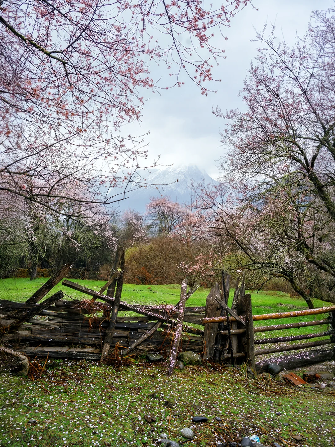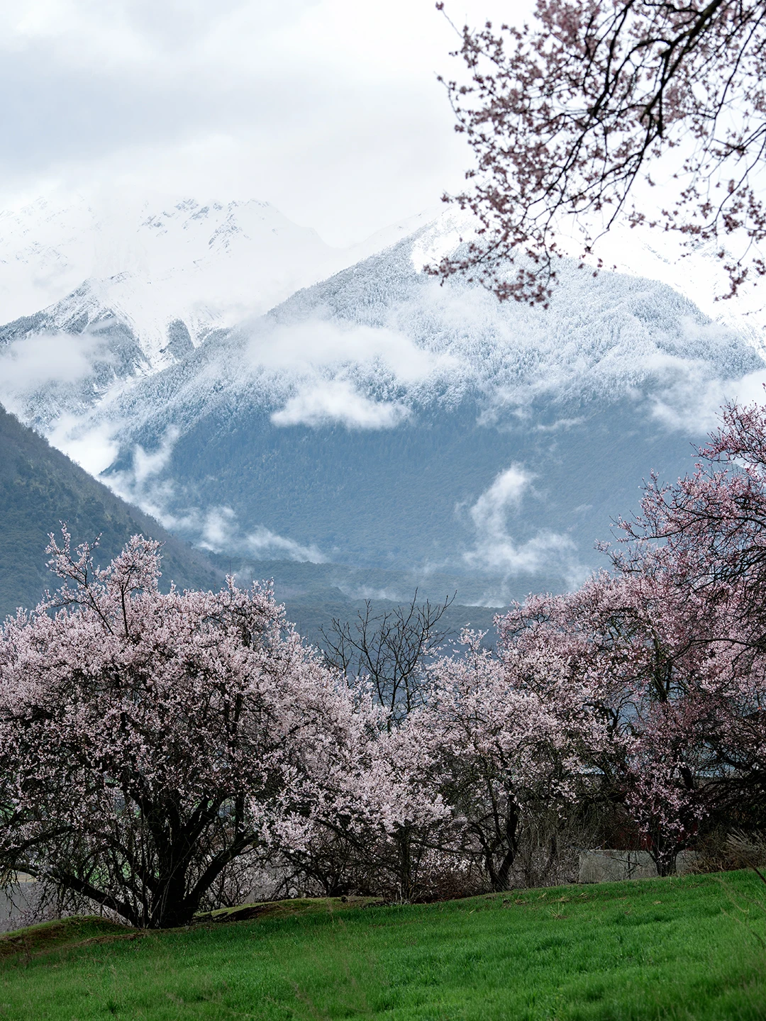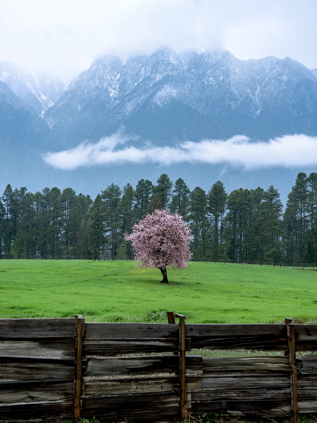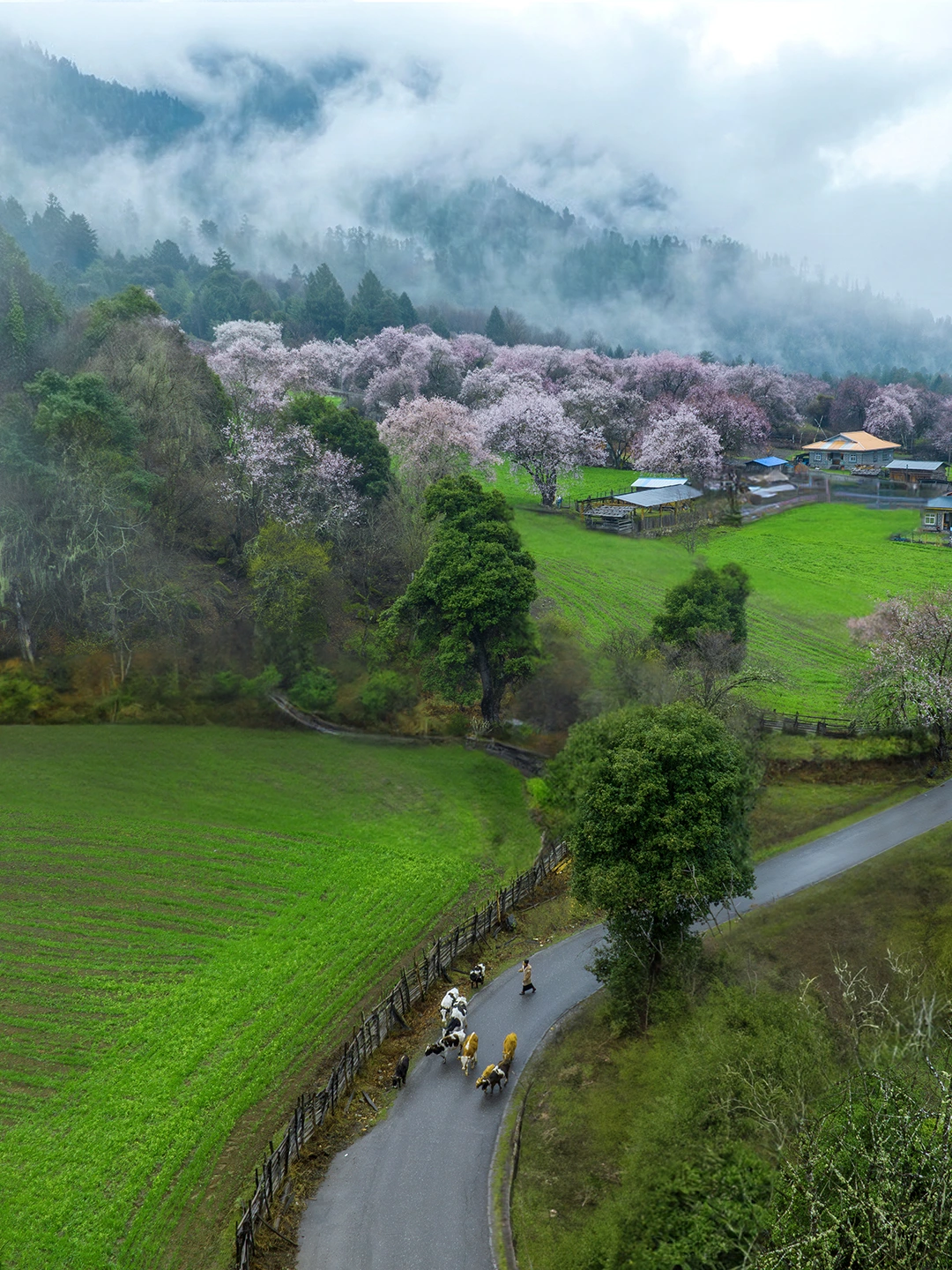 🧭导航:到岗美村方向,不进村,往岗云杉林方向开五分钟左右,会看到这个村子,继续往前还会有三四个绝美的小村落,没有游客,静谧清幽,大片的桃花,云雾缭绕的雪山,整片的草地,牛羊散落,绝对是波密首选。