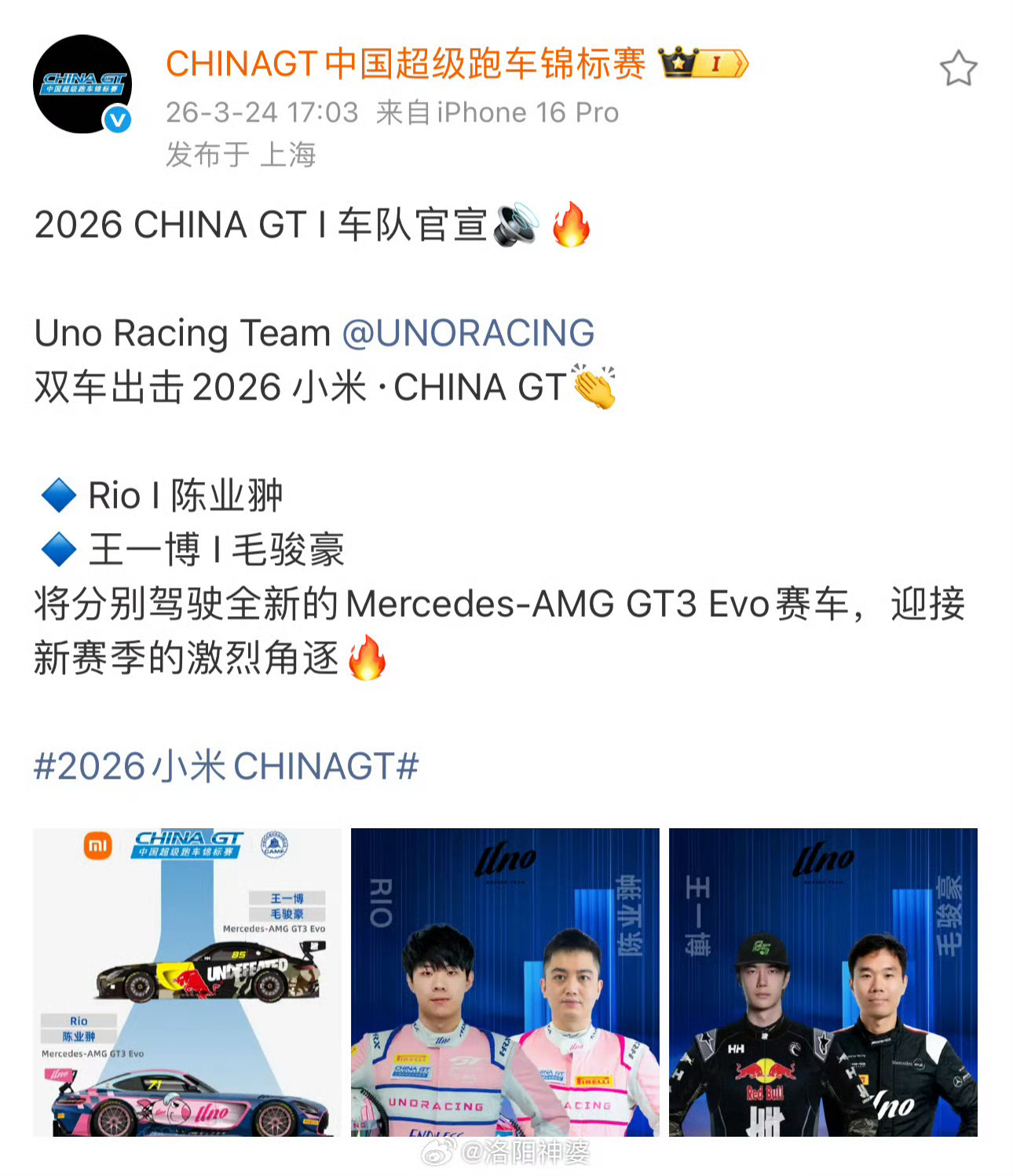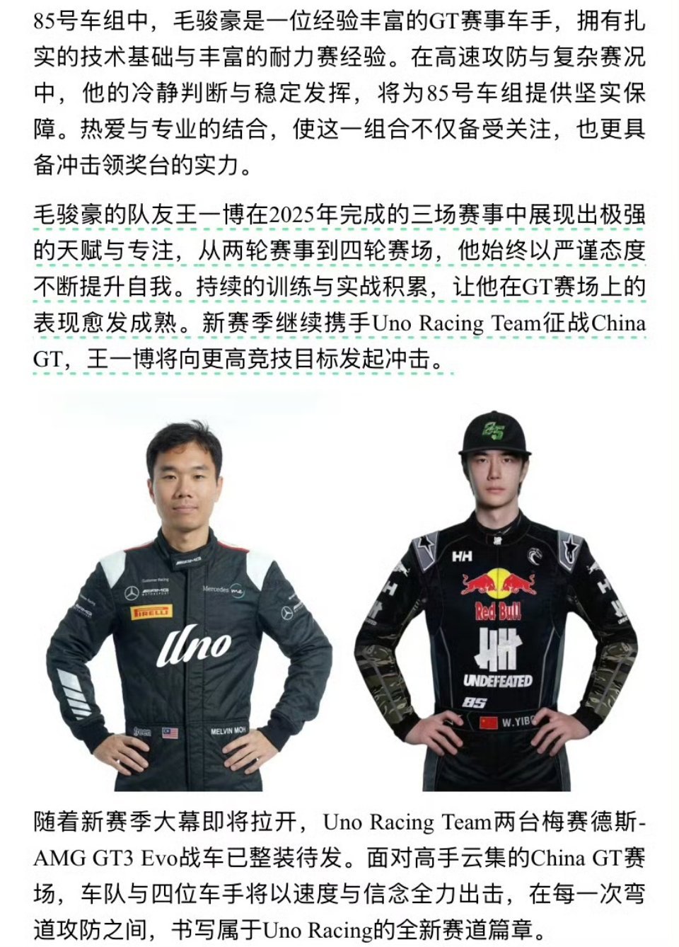 王一博新赛季,85号战车再度启航,以热爱奔赴赛道,以专业迎战挑战,祝驰骋顺利,赛道平安。王一博毛骏豪车队官宣