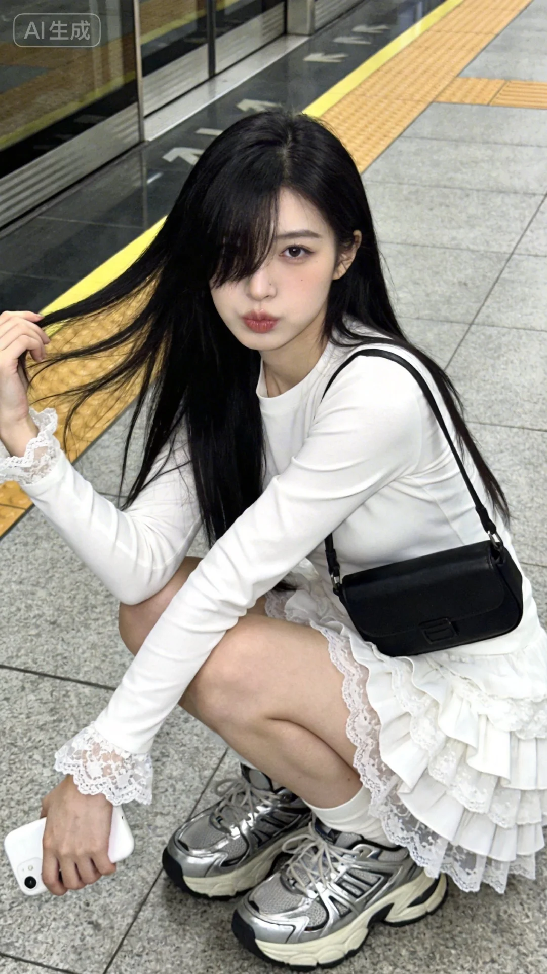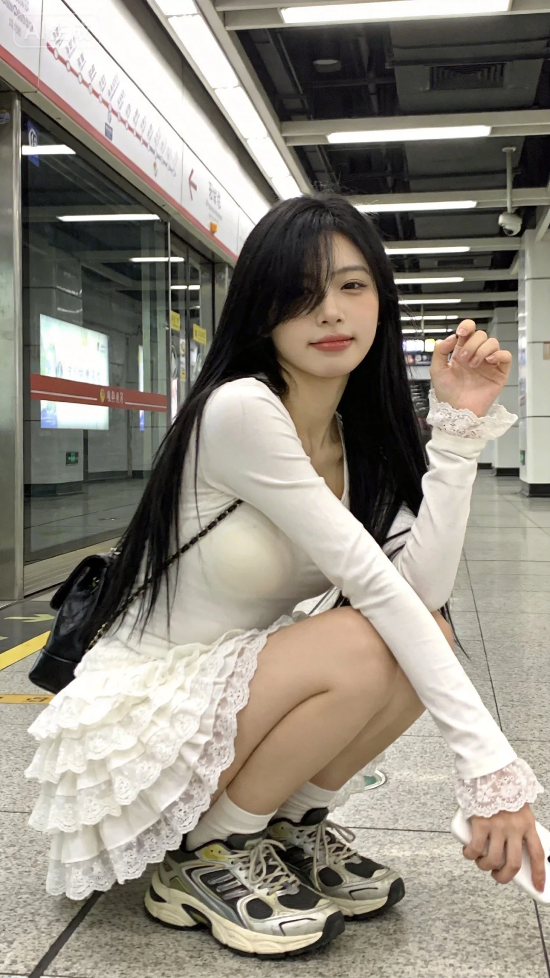 一位长发飘飘模样可爱的女生,上半身特写,冷白皮,小上围,瓜子脸尖下巴,韩系妖治少女,日常生活快照,竖屏正面照,超高颜值美少女,她蹲在地铁站台的地面上,一头乌黑长直发遮挡住了一点半边额头,她穿着白色长袖打底衫,袖口有着精致的蕾丝花边,下身是层层叠叠的白色蕾丝蛋糕裙,脚上蹬着一双炫酷的老爹鞋,肩上挎着个黑色的小包包,一只手握着白色的物品,另一只手搞怪动作。她身体微微蜷缩,姿态放松且慵懒。