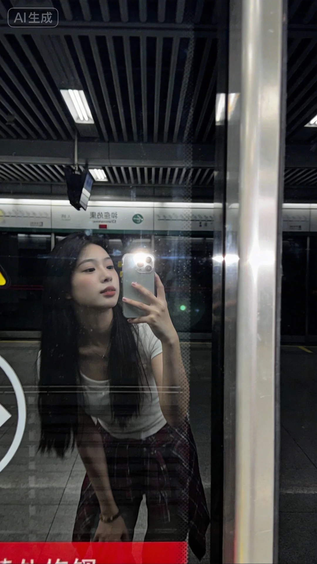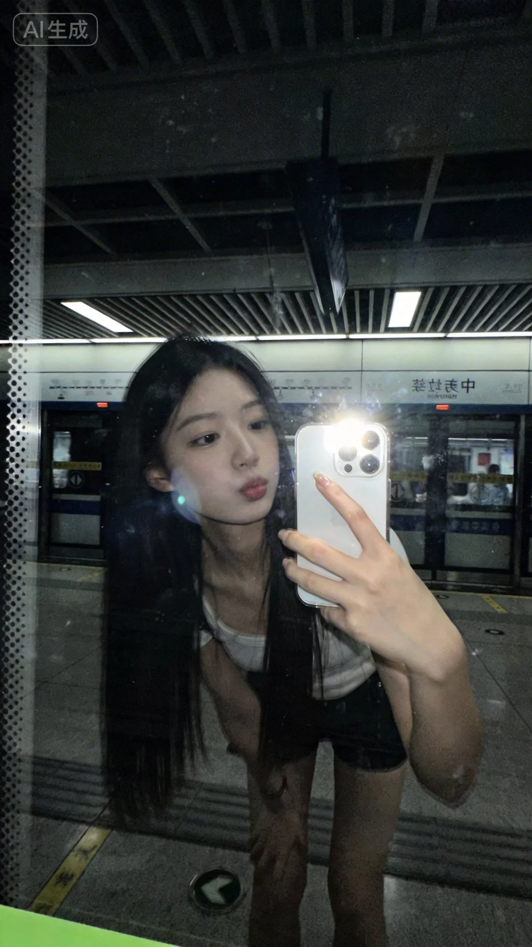 一张极其平凡无奇的iphone快照,没有明确的主体或构图感,随手一拍的快照,昏暗,暗色调,现场感,动态抓拍,高质量,超清画质,略带快门速度不够造成的运动模糊,构图随意、角度尴尬、画面不够对称,低饱和度,开启闪光灯,低角度仰拍, 年轻气质美女,纯欲风,皮肤白皙,偶像气质,长直发,清纯可爱穿搭,青春气息, 场景为地铁站内,在屏蔽门前,用屏蔽门的玻璃作为镜子,用 iPhone 后置镜头自拍。