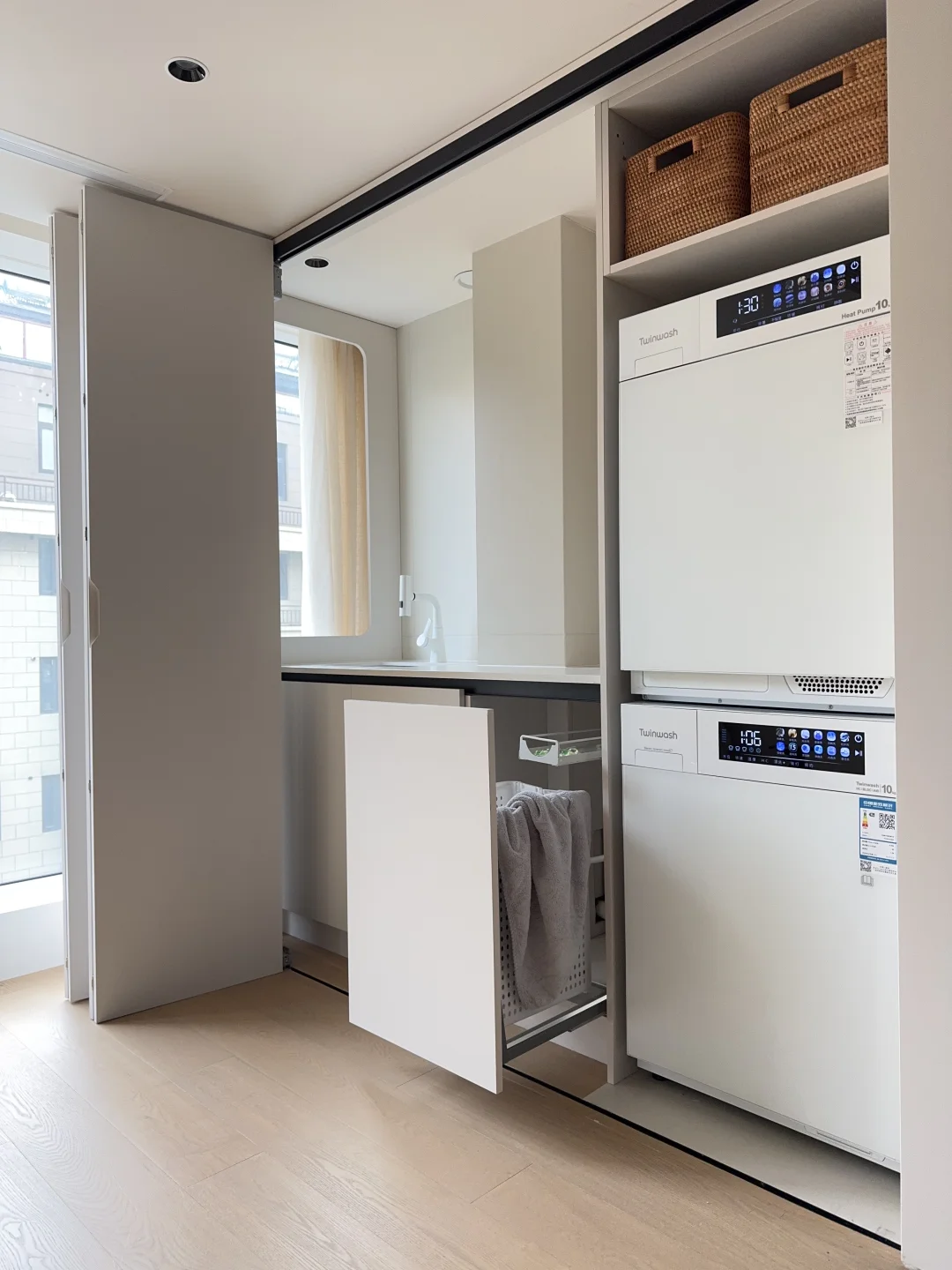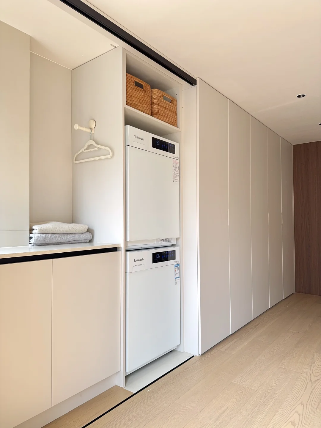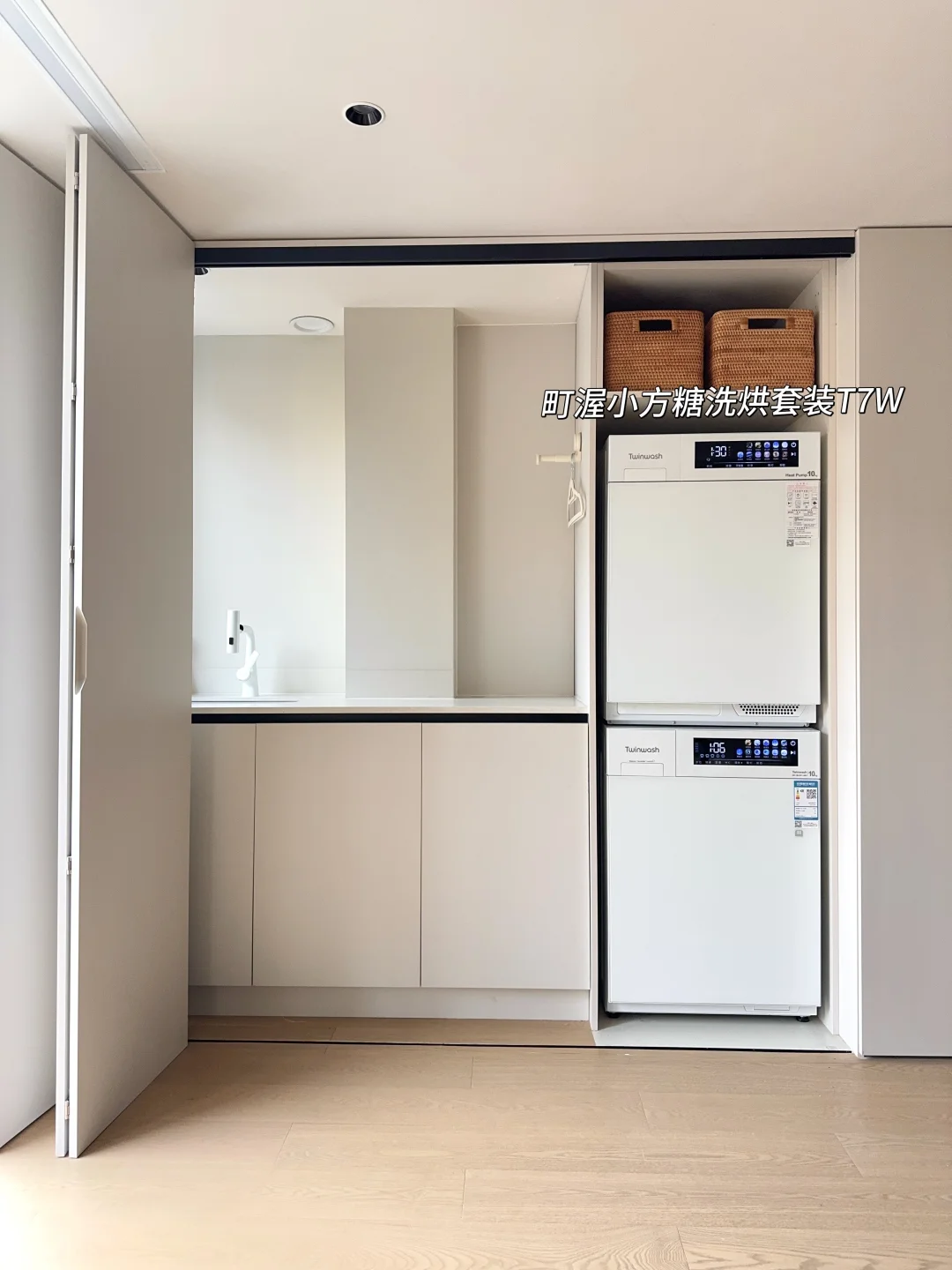 新家的柜子里有个2㎡隐藏洗衣区深得我心!双扇折叠门一拉就是家政区,关上就是完整的收纳墙,为了配合这个洗衣区我做足功课,最终选了Twinwash町渥小方糖洗烘套装T7W,纯平全嵌进柜体,不仅不浪费一寸空间,全面屏一体化设计操作顺手,用了一个月越用越满意,真心觉得这钱花得太值了!