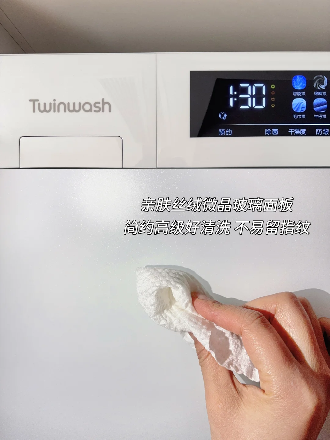 小方糖的机身正面、侧面都是纯平0凸起,搭配亲肤丝绒微晶玻璃门板,和我家洗衣机柜简直完美融合,还不沾指纹、不易挂污,日常打理也省心,轻轻一擦就干净!