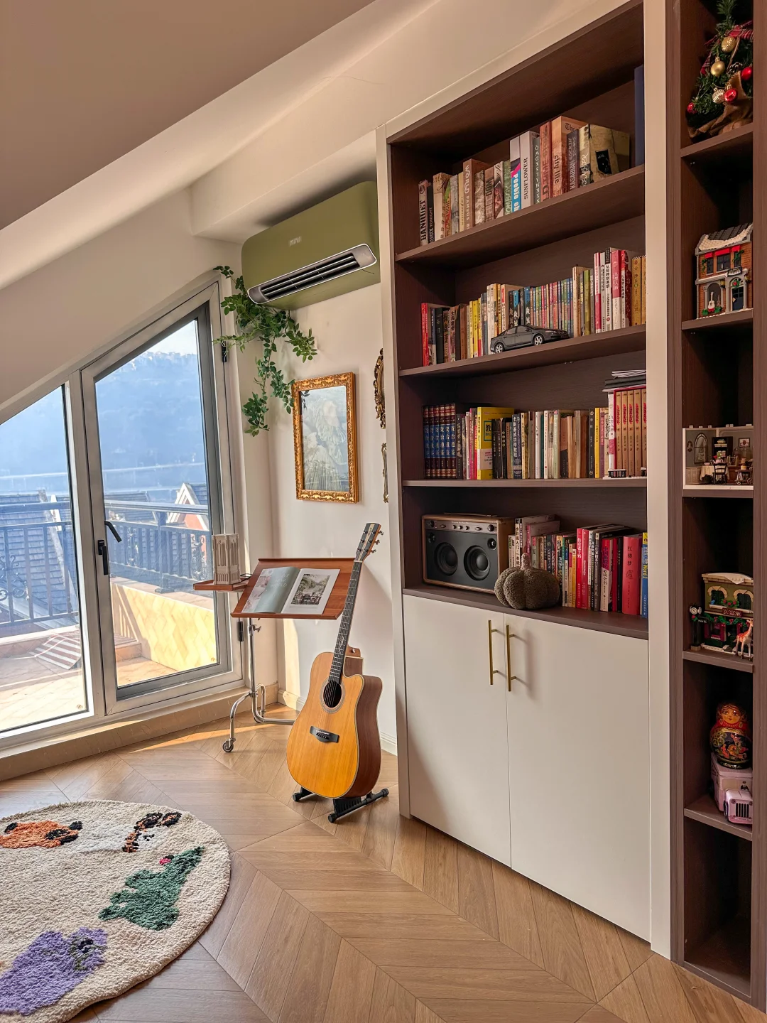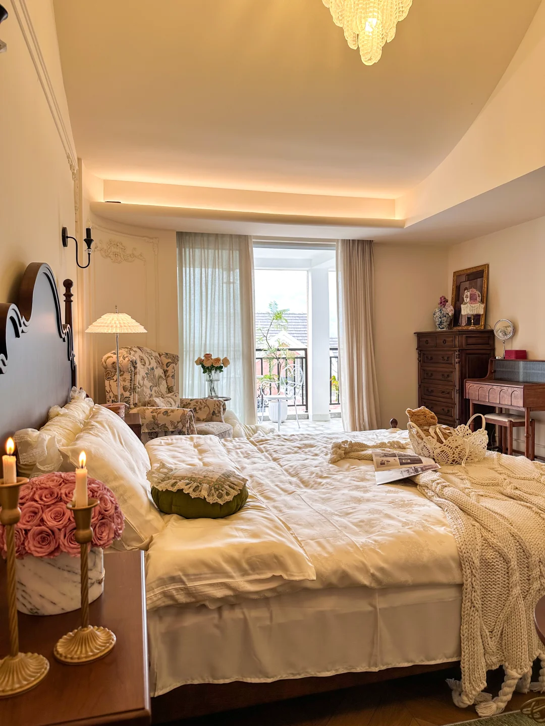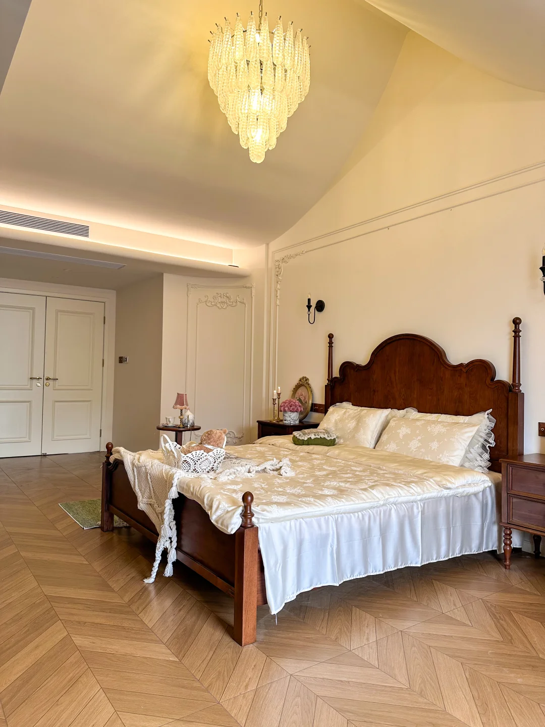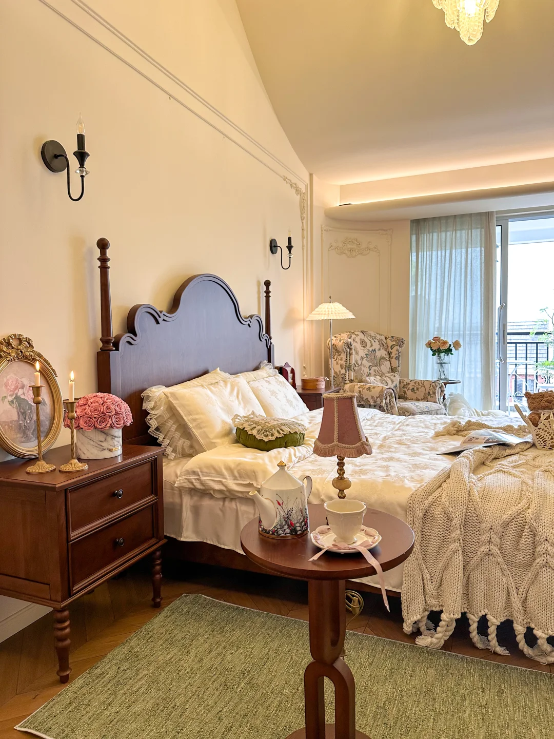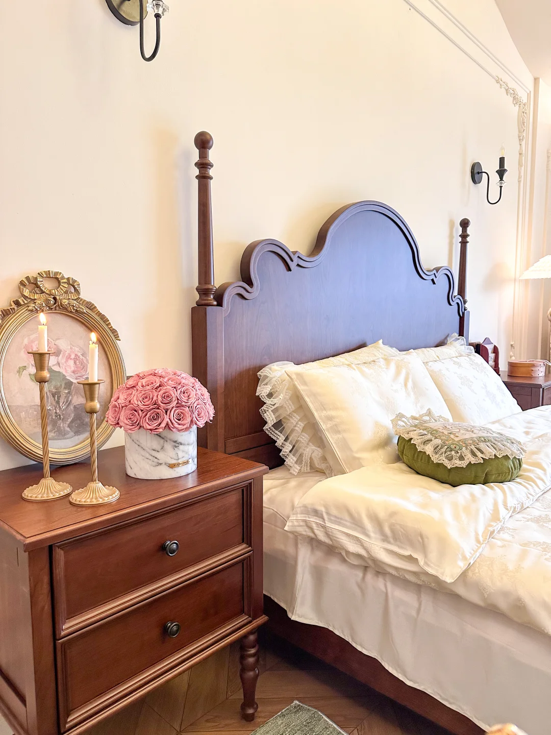三楼的家,藏着不被打扰的自在,卧室更是这份温柔的最佳载体。 全屋都用了温润的木质家具,偏爱实木自带的天然纹理与温润触感,床选了熙和爱丽丝床,北美樱桃木的摩卡色自带复古滤镜,像住进了藏在时光里的温柔城堡。 猫咪在被窝里发出轻轻的呼噜声,窗外的树影贴着纱帘摇曳,低楼层的家,有一种不被打扰的静谧与自在。