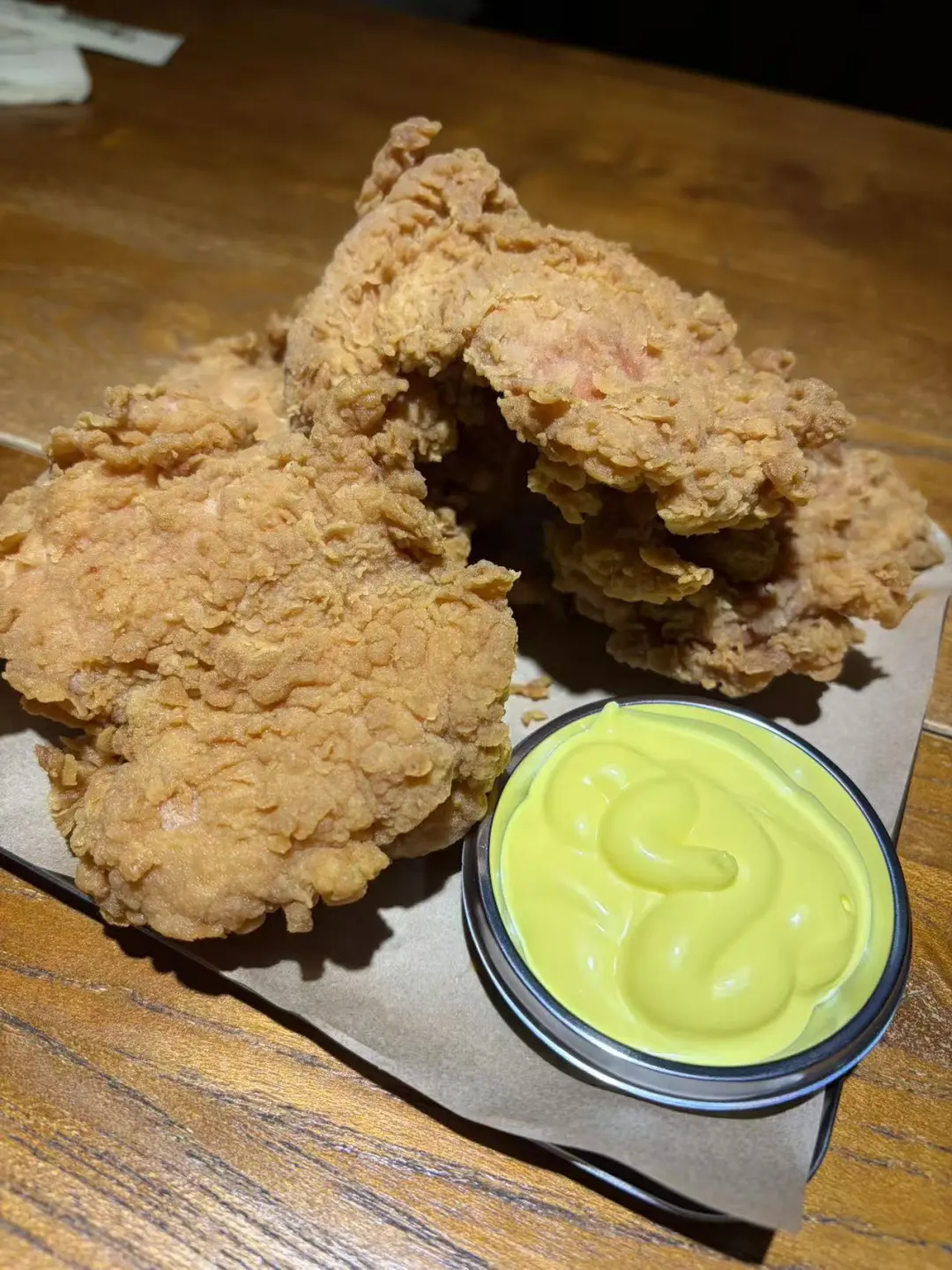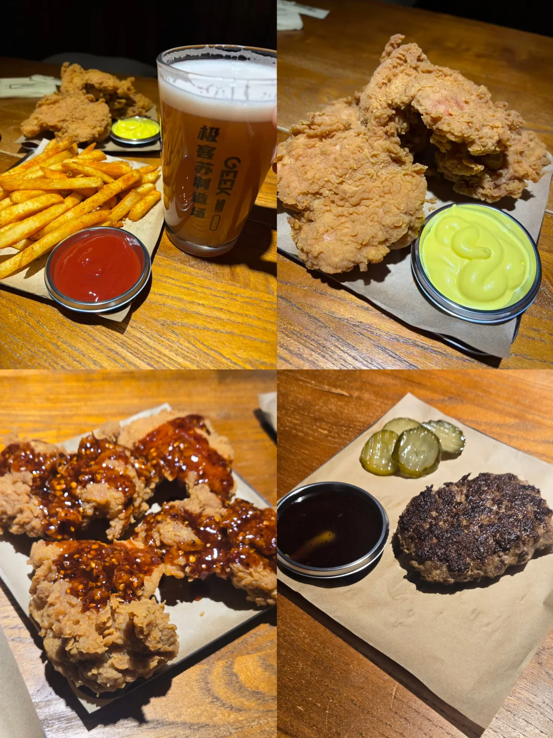 这个酒馆的炸鸡怎么能做的表皮那么酥脆里面的肉汁水还多呢。真无敌了 汉堡的酱料是店内特调的吃起来不腻口感正好 薯条上面有一层料也挺好吃 但是最最惊艳的就是炸鸡,炫去吧。我自己一个人干了一盘子炸鸡,绝对不踩雷。 老板也是健身人士店内还有增肌牛肉饼可以吃, 下次去在喝点啤啤吧这次开车了[哭惹R]
