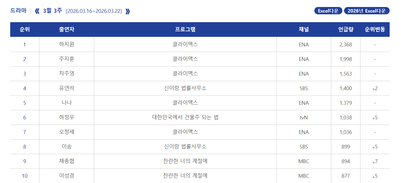 2026年韩国3月第3周Racoi演员话题性热度排名:1.河智苑 《权欲之巅》2.朱智勋 《权欲之巅》3.车珠英 《权欲之巅》4.柳演锡 《神与律师事务所》5.林珍娜 《权欲之巅》6.河正宇 《在大韩民国成为屋主的方法》7.吴政世 《权欲之巅》8.李絮 《神与律师事务所》9.蔡钟协JongHyeop 《在你灿烂的季节》10.李圣经 《在你灿烂的季节》