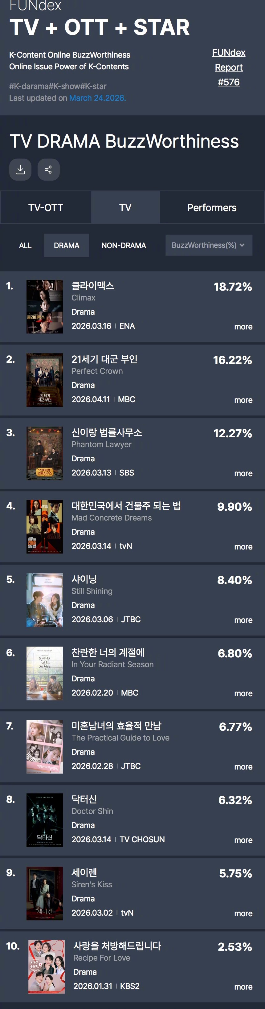 GOODDATA公布2026年3月第3周电视剧热度话题性排行。1.韩剧权欲之巅 18.72%2.韩剧21世纪大君夫人 16.22%3.神与律师事务所 12.27%4.在大韩民国成为屋主的方法 5.韩剧依然闪亮 6.韩剧在你灿烂的季节 7.韩剧未婚男女的效率恋爱 8.申医生9.魔女之吻 10.爱情处方签
