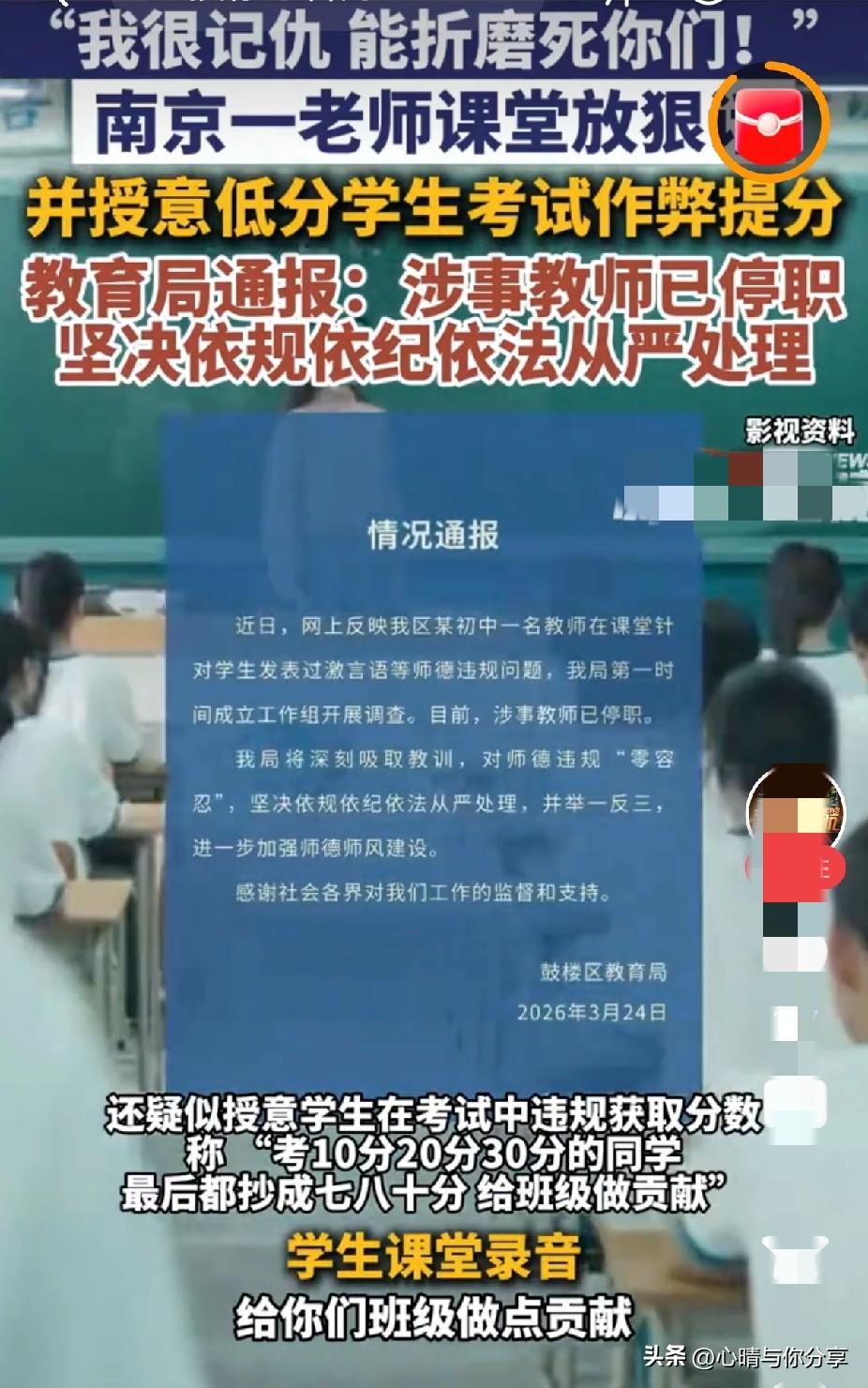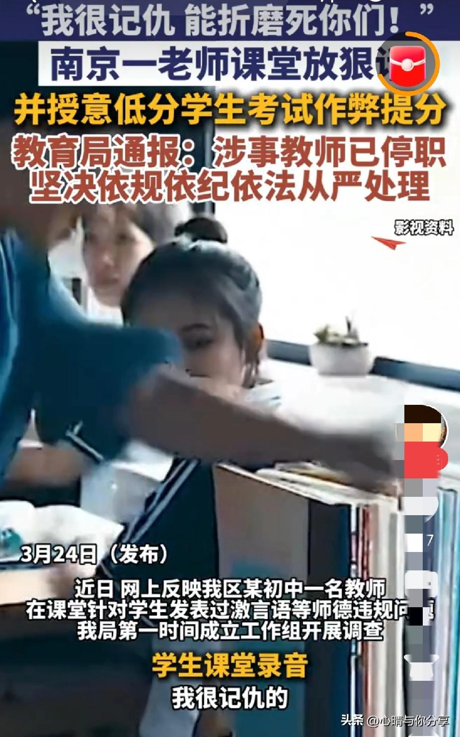 南京这位发表过激言论的英语教师张某现在可能挺后悔的吧, 没想到自己的一时心直口快,不仅被曝光,还把自己的铁饭碗弄丢,肠子都悔青了吧! 近日,南京某初中教师因课堂发表“折磨到死”等过激言论被停职,媒体批评此类语言暴力比体罚更伤人,引发对师德底线和教育功利化的讨论。 作为一名老师,首要任务是完成各项教学指标,让学生学有所获,德智体美劳全面发展!而不是只顾眼前的成绩,更不能为了明面上的成绩,使用不光彩的手段。 显然张老师不仅没有遵守规则,还变本加厉!为了刺激学生,竟然发表过激言论,辱骂贬低学生,难道不知道言语暴力有时候比体罚的伤害更大吗? 想要教学质量提高,只是一味的言语施加压力是没用的,更重要的是要掌握方式方法,循序渐进,而不是急功近利。心直口快,说这些不过脑子的话,只会显得自己无能! 如今被曝光,不仅被免职,还可能面临无书可教的困局!毕竟没有哪个学校愿意招一个“刺头”吧? 现在后悔也没用了,早知今日何必当初呢?成年人要为自己的行为负责! 大家觉得呢?