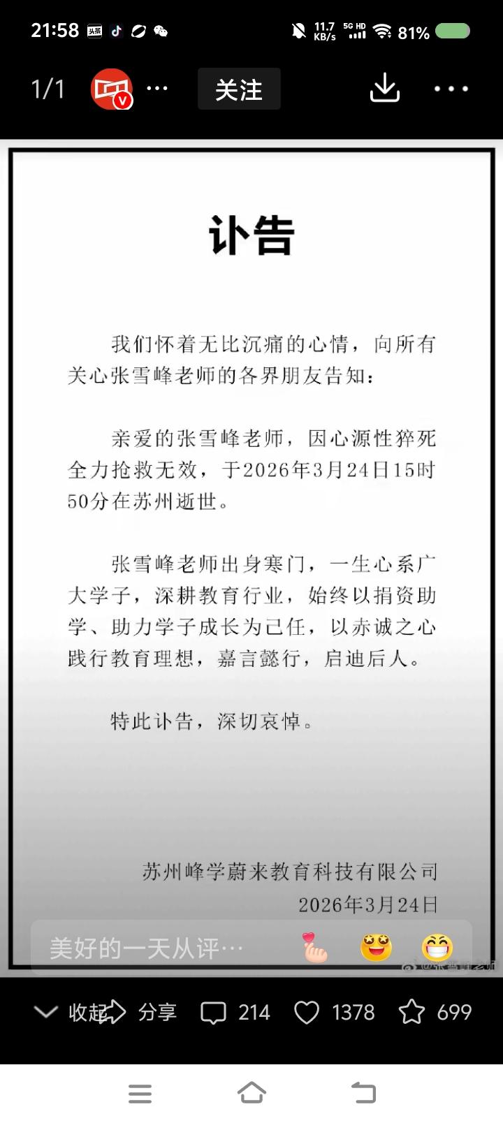 真的实锤了!张雪峰公司发文了!张雪峰老师因为心源性猝死抢救无效去世了!讣