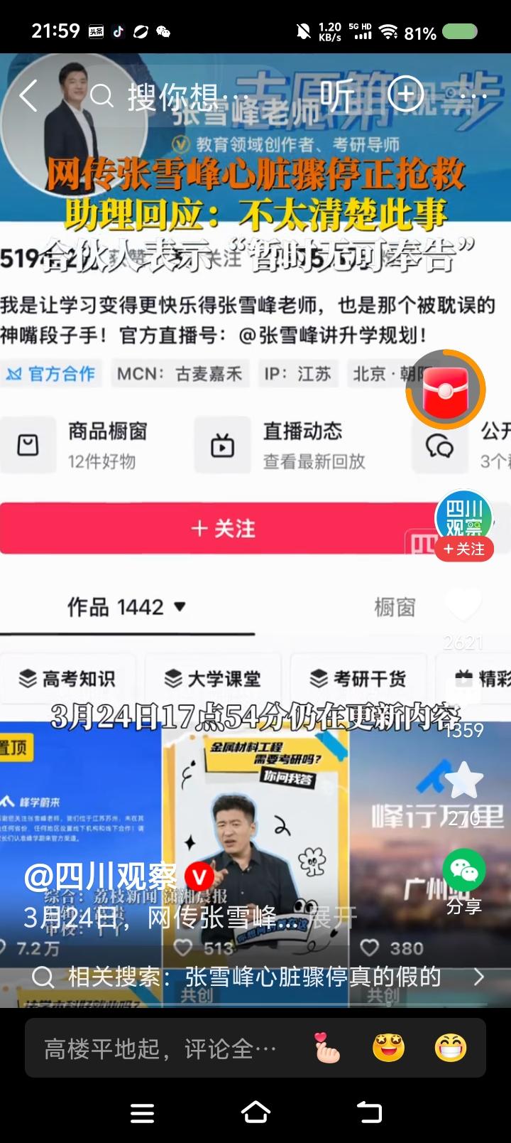 张雪峰与3月24日的下午—— 据报道,张雪峰3月24日15时50分去世。而他的视频平台账号17:54仍在更新内容。 点评: 为什么不及时停止更新? 他的账号别人可以用吗?