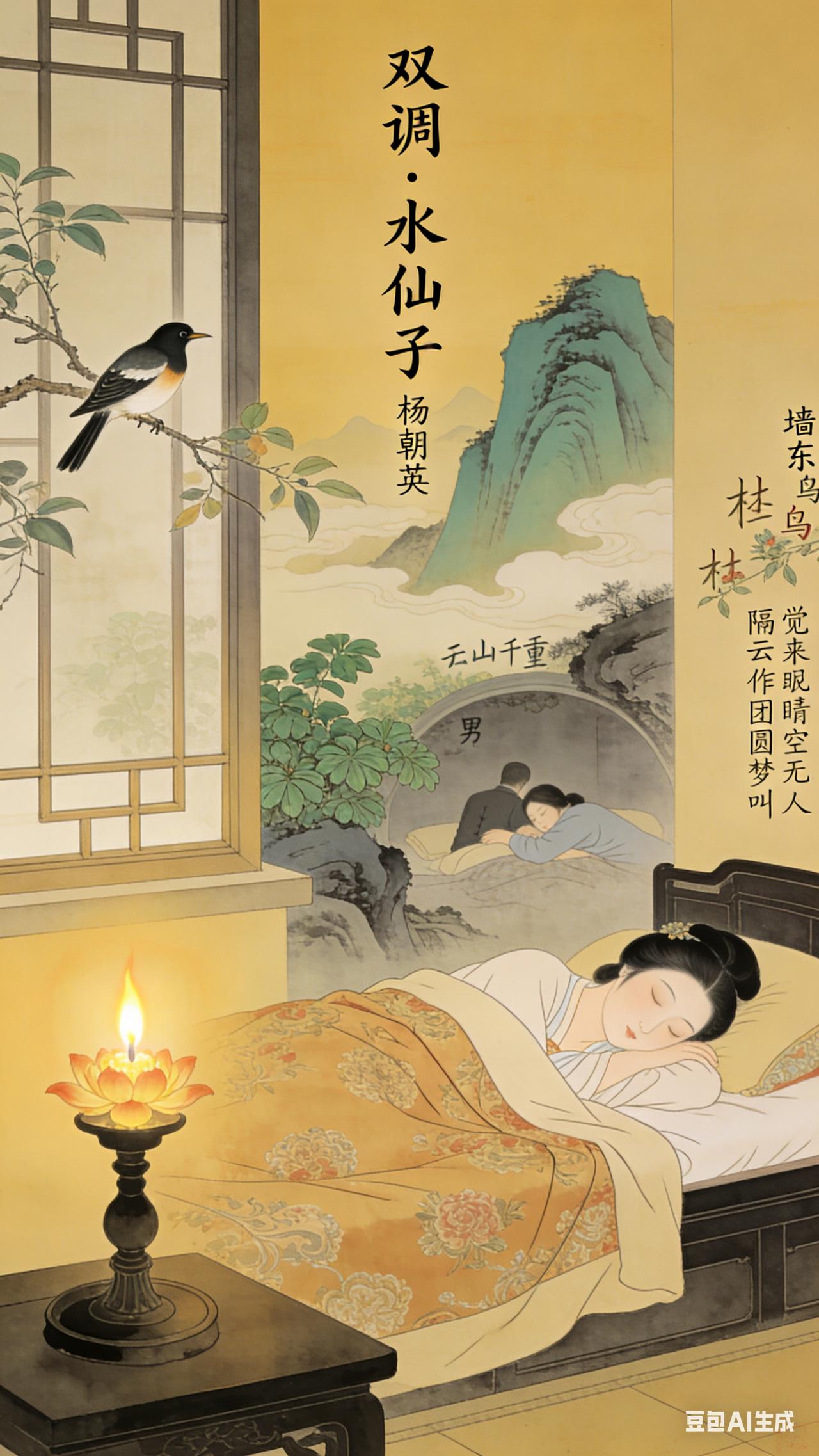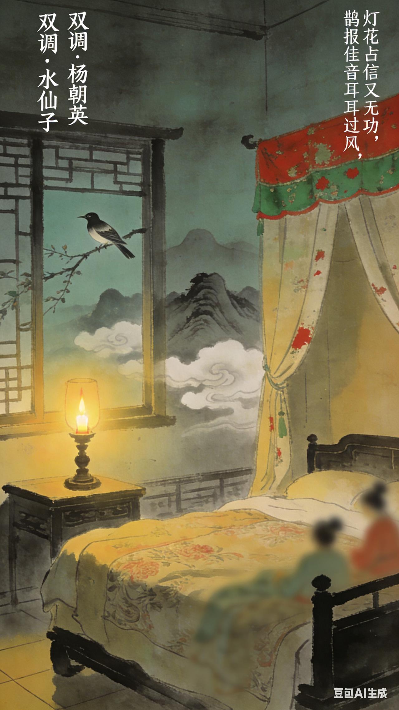 《双调》水仙子、杨朝英。 灯花占信又无功,鹊报佳音耳过风。绣衾温暖和谁共?隔云山千万重,因此上修绿愁红。不付能博得个团圆梦,觉来时又扑个空。杜鹃声啼过墙东。 《水仙子》现译:: 灯花占卜吉兆又一次落空,喜鹊报喜的叫声如耳边风吹过。绣花被褥再暖和又能与谁同眠?你我之间隔着千万重云雾山峦,害得我连梳妆打扮都没心情。好不容易才盼来一场团圆美梦,醒来时却又是一场空。只听见杜鹃鸟的哀鸣从墙外幽幽传来。 武陵春词牌 鹊桥仙词牌 双调水仙子 杨朝英词 第七春礼调 双调九十八字