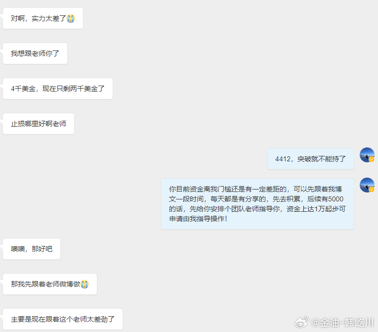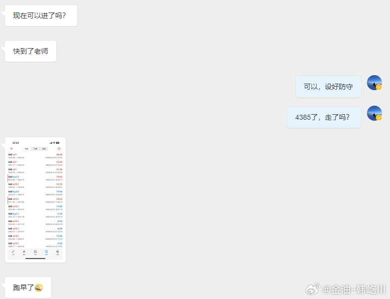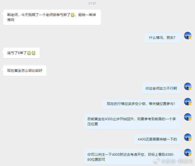 黄金4350终还是止住了,回反突破4400线后,首要承压点则参考4405附近,前面有粉丝哭诉并咨询后续如何操作,老韩也是给到了一单参考思路给他,4405附近可以开波空,目标看到4385-80位置!