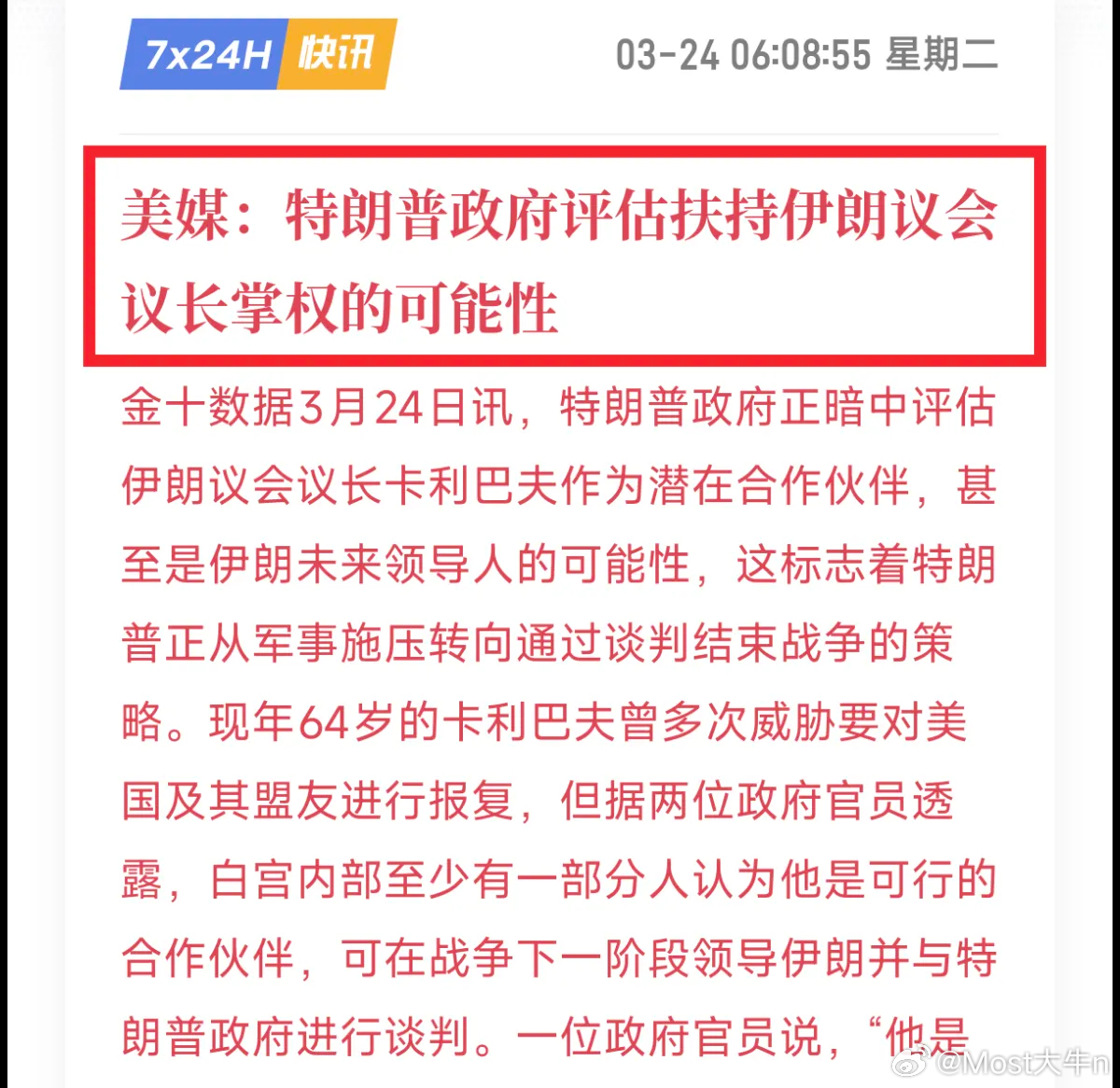 据美媒报道:懂王企图扶植伊朗议长卡利巴夫,成为伊朗未来的领导人,并通过与他谈判,来达成一份所谓的“停战协议”,然后胜利撤兵。