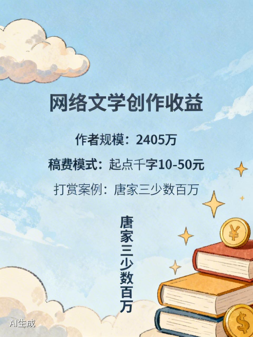 网上写小说能赚钱,但情况因人而异。《2023中国网络文学发展研究报告》显示,2023年网络文学作者规模达2405万人。像翟鹏延最初写小说一个月就几百块,杨吉一开始也没挣到钱。 不同平台收入模式不同。起点中文网新人签约稿费每千字10 - 50元,100万字小说按每千字20元算,基础稿费有2万。还有读者打赏,唐家三少作品打赏曾达数百万。优秀小说出版版税一般8% - 15%,影视改编更能带来丰厚收入,比如《琅琊榜》等。不过,大多数普通作者很难达到顶尖水平,想靠写小说赚大钱并不容易。