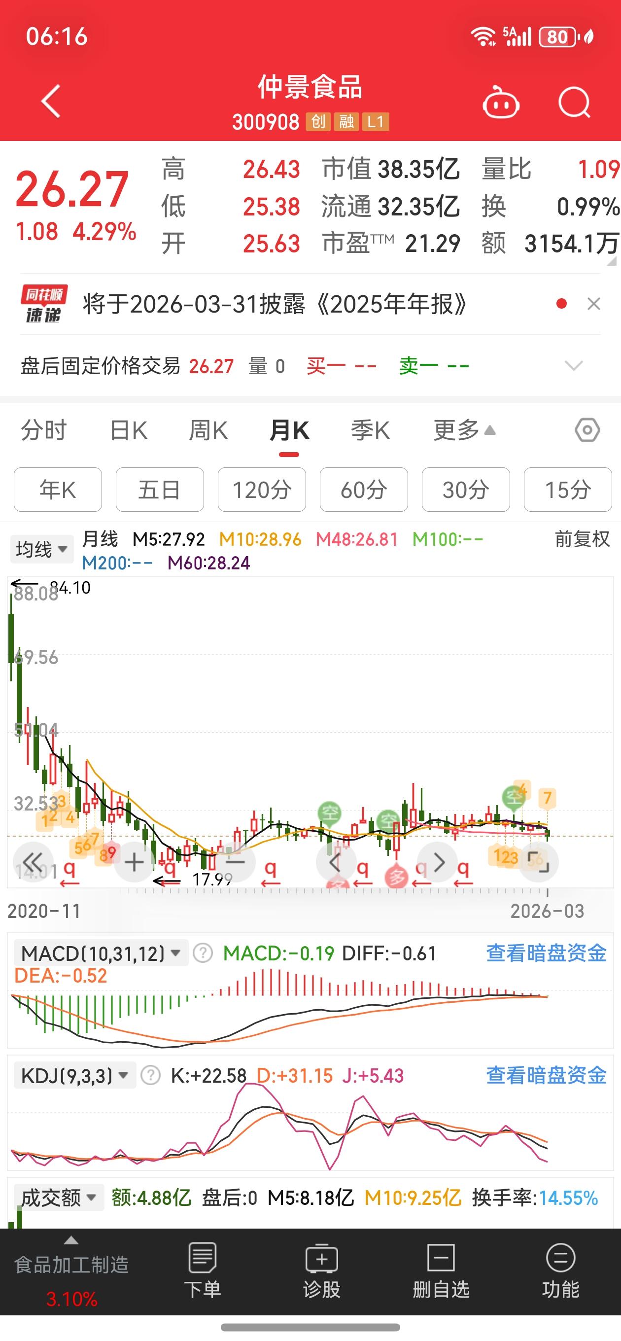 @同花顺财经 @同花顺数据可视化 图片显示“上市以来涨幅+7.74%”?同花顺,你们的机器人是脑子吃屎了吗? @仲景食品 上市以后到现在含跌33.9%,你对得起买你票的这些韭菜吗? 发行价:39.74元 最新价:26.27元 实际涨幅:(26.27-39.74)/39.74 \approx -33.9\% 所以图片里的“+7.74%”是错误数据,实际是下跌约33.9%。