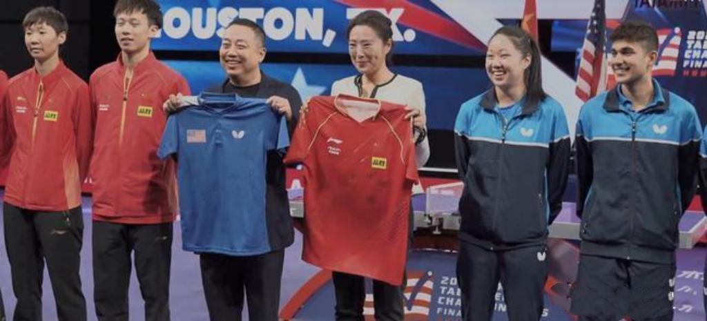 6人同框:王曼昱延项秀颈,身材高挑;刘国梁喜容绽放,满面春风;沈伟妮梨窝精致,笑意盈盈;美籍华裔乒乓球员张安眉欢眼笑,齿如珠贝;左二那位双目微阖的球员是林高远吧?右一的小伙是谁?