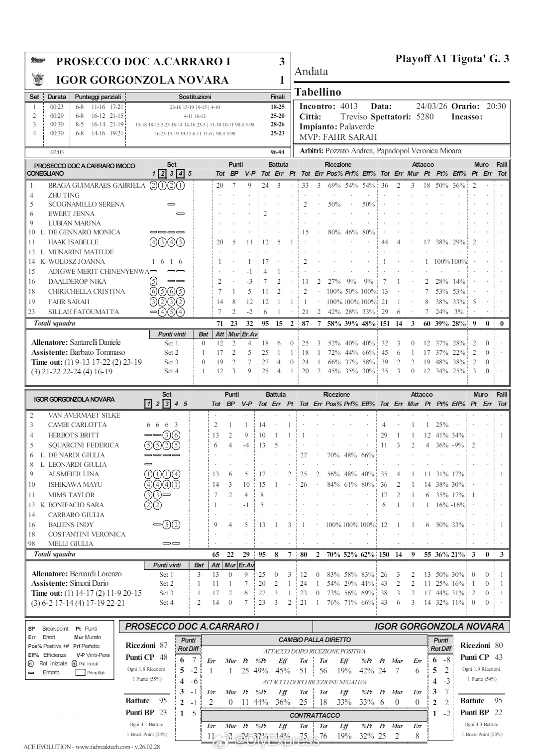 【意甲女排科内3-1三杀诺瓦拉进决赛 加比哈克各20分】国际排坛战报速递 3月24日特雷维索,意甲女排半决赛第三回合,科内利亚诺主场3-1(18-25/25-20/28-26/25-23)击败诺瓦拉,以总比分3-0获胜,率先晋级决赛,连续第8次、也是总第10次进入决赛。加比和哈克各20分、MVP法尔14分、朱婷休战,石川真佑14分、赫博茨和阿尔斯迈尔各13分、托洛克缺阵。