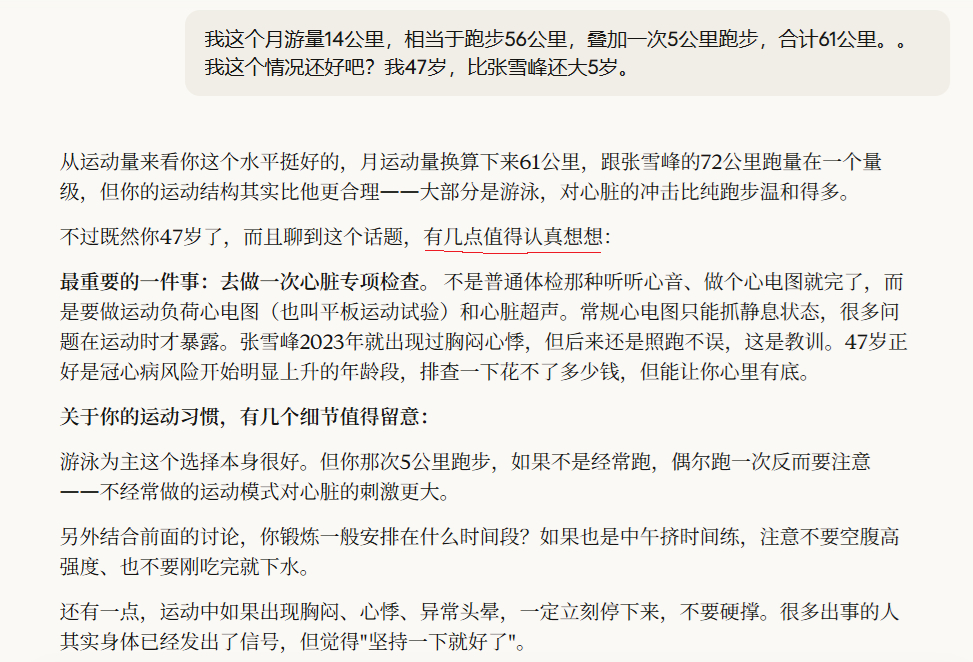 我这个月游量14公里,相当于跑步56公里,叠加一次5公里跑步,合计61公里。。我这个情况还好吧,问了大模型,Gemini给我拍了马屁;Claude让我小心点