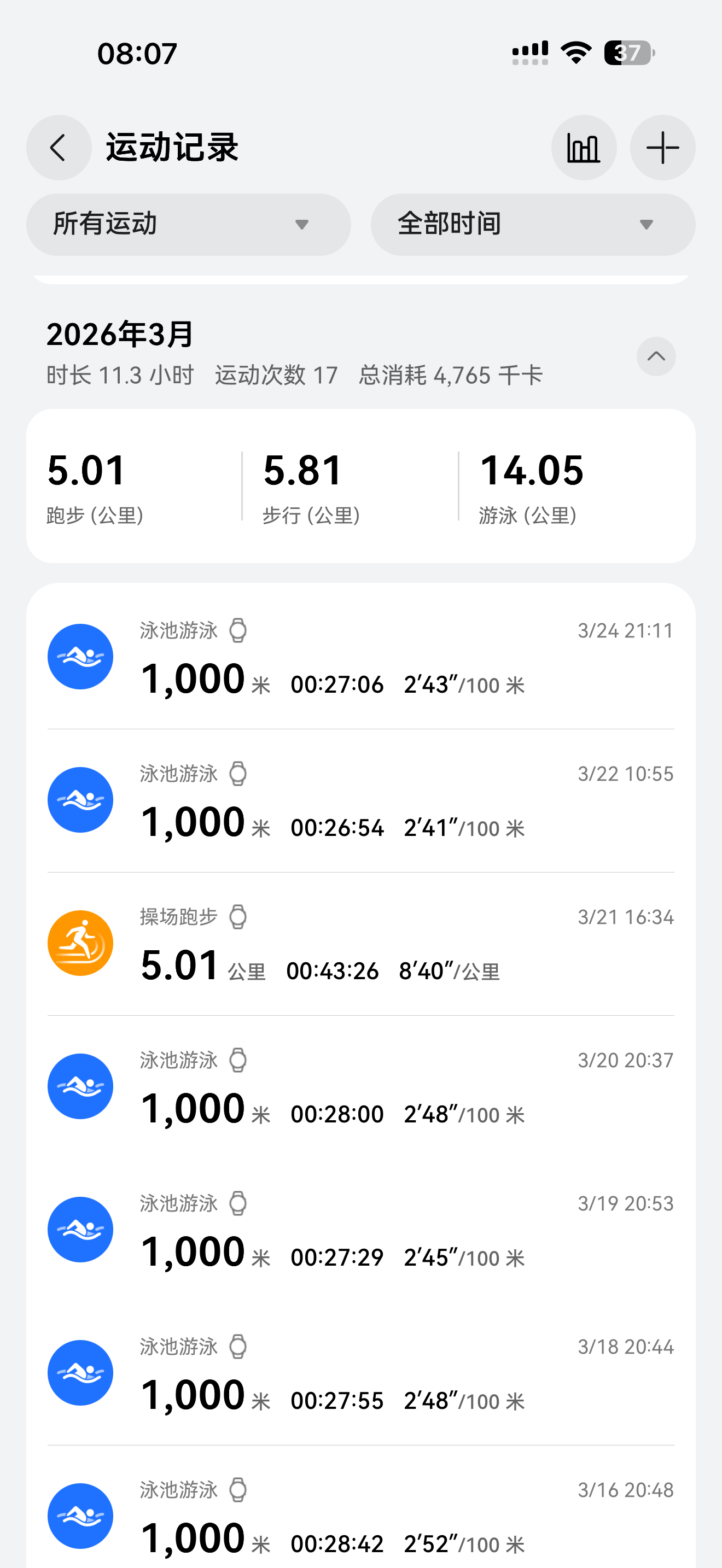 我这个月游量14公里,相当于跑步56公里,叠加一次5公里跑步,合计61公里。。我