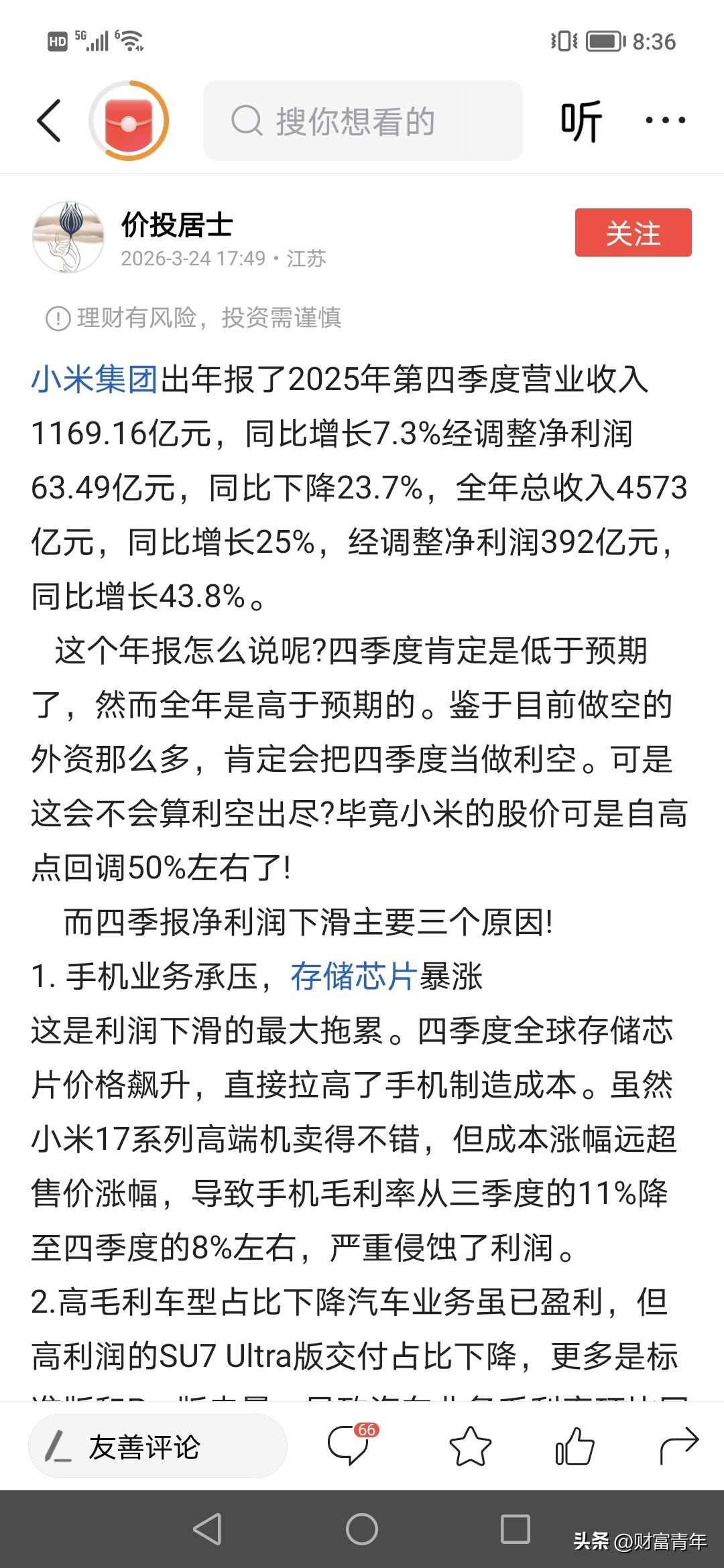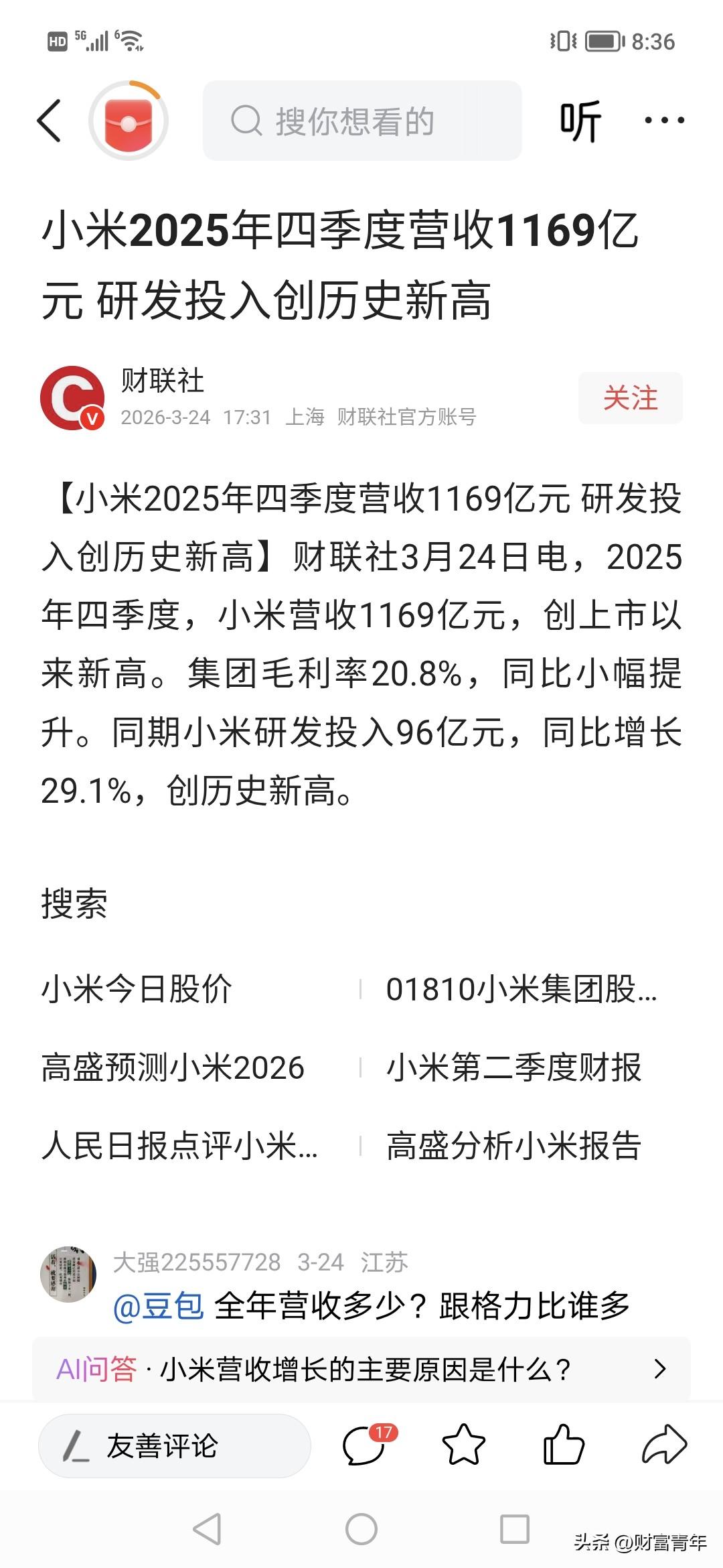 小米牛逼了,一年给5万人发工资300亿,每个人平均50多万。!!去年收入近4500亿,利润近400亿,涨40%!! 所以说,现在的钱都给科技公司赚走了,在这些公司上班的人暴富,其他人每天都说太难了。这就是当下。小米在广东深圳都有总部,都有研发中心啊。赚钱 小米汽车利润 打工人 小米有前途