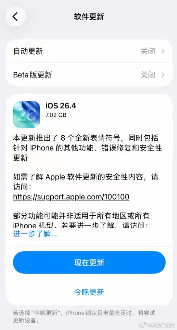 iPhone大量新功能上线苹果iOS 26.4系统更新了,14个新功能速览快速了解👇-🎧 Apple Music1️⃣专辑/歌单全屏动态封面2️⃣播放列表Playground AI一键生成歌单3️⃣歌曲可同时加入多个播放列表4️⃣内置艺人巡演&附近演出资讯5️⃣环境音乐小组件,锁屏快捷播放-⏱ 效率 & 安全1️⃣提醒事项自动汇总紧急任务+闹钟提醒2️⃣个人热点流量使用实时显示3️⃣失窃设备保护默认开启-🎬 影音 & 辅助1️⃣录像变焦时自动强化主体收音2️⃣播客视频/音频切换+离线下载3️⃣车辆静止时CarPlay可播放视频4️⃣即时字幕新增中文(台湾)5️⃣降低高亮度闪烁效果6️⃣新增8款Emoji表情