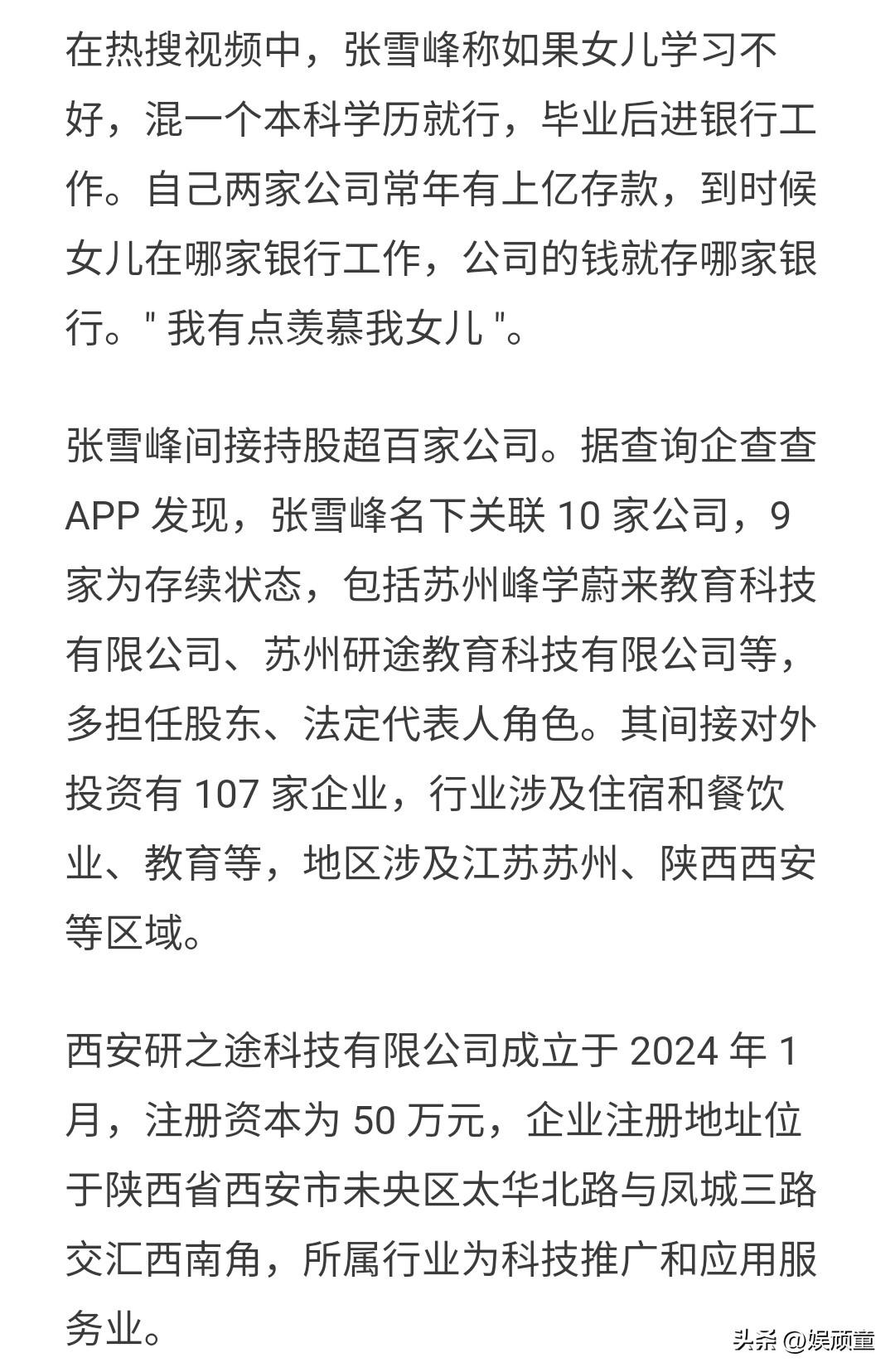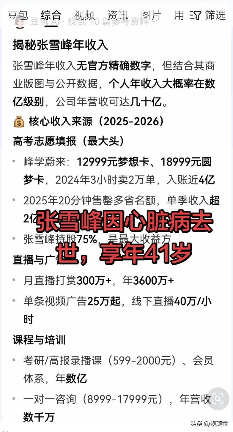 张雪峰英年早逝,就是太想赚钱!工作和休息没有平衡好。 张雪峰的收入分三部分,第一部分就是每年高考前卖卡,一对一咨询,这是其最忙碌的时候。 第二就是直播,到处讲座。一次从几十万到几百万不等。 第三就是股权投资,成名没几年,对外已经投资了107家企业。 如果不是英年早逝,再给他十年时间,会成为80后一代代表企业家。 这就是网红的难处,想要挣钱,那休息时间就不够。像张雪峰的公司,收入太依赖于他。因为学生父母视频咨询,企业邀请他讲座,是看他这张脸,换成他老婆都不认。