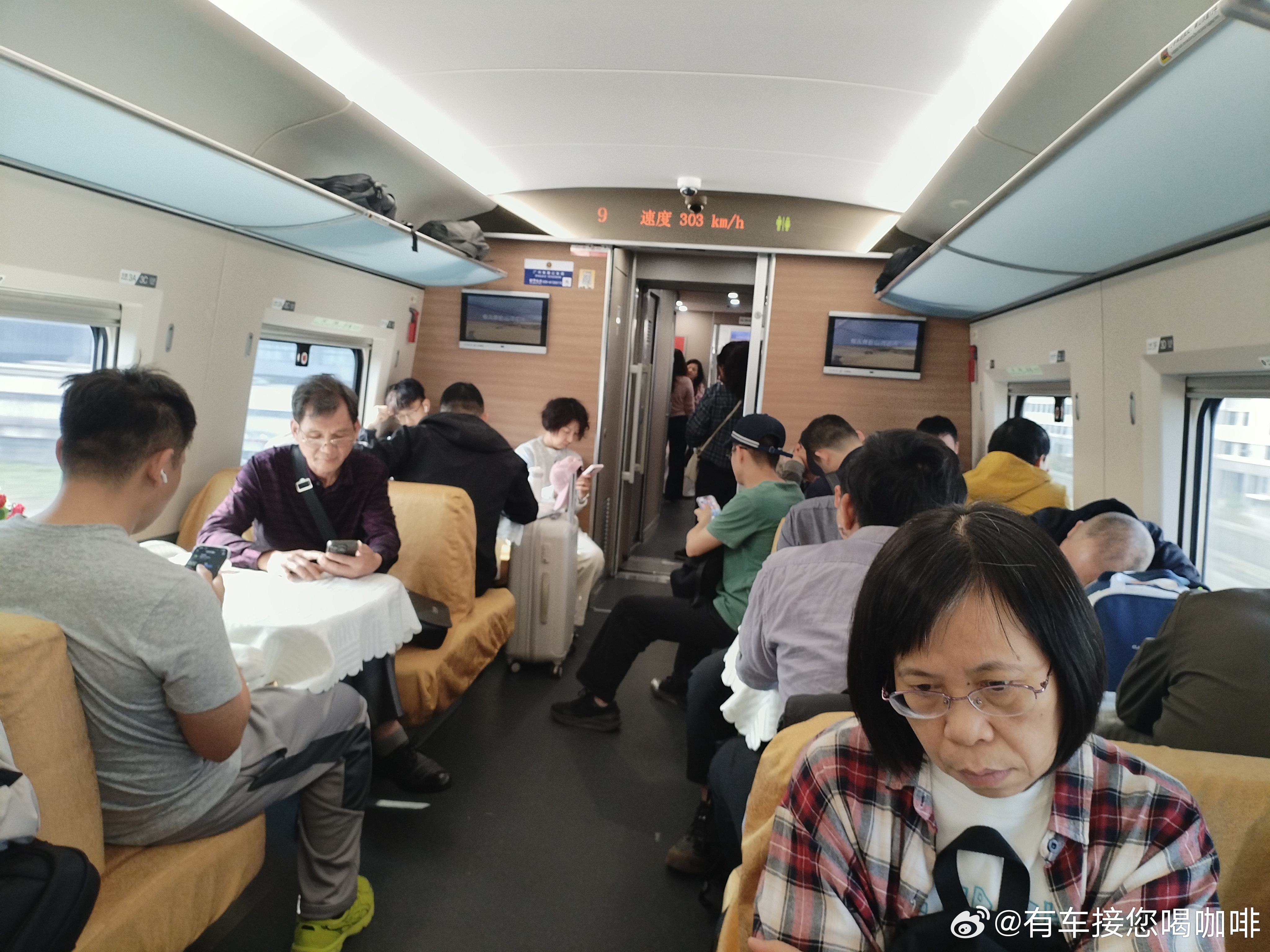 高铁进站,时速300公里,方向广州北至汕头,买的无座票,在餐车找到座。2026年
