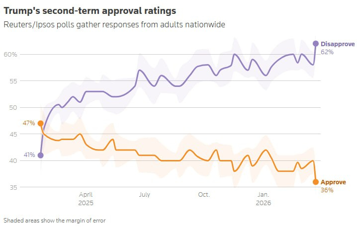 路透社/益普索的一项民意调查显示,特朗普的支持率已降至 36%,这是他重返白宫以