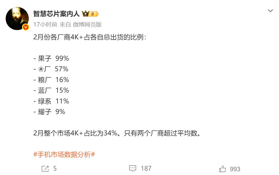 苹果99%华为57%某米16%,高喊高端成了,却惨遭数据打脸!   某米的粉丝一直高喊高端成了,然而却一次又一次地惨遭数据打脸,从数据来看,高内高端手机只有苹果和华为。   根据第三方博主公布的数据,2026年2月国内手机市场,4K+高端手机出货占比为34%。具体到各品牌,苹果高端手机占比为99%,华为高端手机占比为57%。国内6大主流品牌中,只有苹果和华为高端手机占比超过平均水平,也只有苹果和华为高端手机占比超过50%。   安卓4大品牌的高端手机占比都在20%以下,且都不如平均值的一半。某米高端手机占比为16%,vivo高端手机占比为15%,OPPO为11%,荣耀为9%。   某米的高端手机占比虽然在6大品牌中排名第三,但远落后于苹果和华为,根本就不在一个层面。在安卓阵营中,某米也不是断层式领先,只比vivo高1个百分点。   安卓阵营高端手机占比低,根本原因在于核心技术缺乏,大家都采用第三方高通/联发科处理器,都搭载Android系统,手机同质化严重,缺乏差异化竞争力,自然难以支撑起真正高端的溢价能力与用户心智。