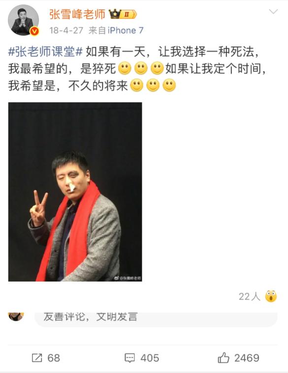 看到张雪峰18年4月27日发的一个状态, 我告诉家人三个决定: 1、平时不要说不吉利的话,有些玄学不得不信,人有时候就想心想事成,因此前辈的习惯总是好的,逢人对事都要挑好的话来说,如果不小心说坏话要自掌嘴巴,要撤回。更不好把不吉利的话公开发,尤其是社交媒体,能量这东西很玄乎。 2、不要半路开香槟!有人还是发现,张雪峰现在的状态太狂了,每天更新状态,每天直播就感觉他很飘,仿佛自己的人生就是开了挂一般,好像已经赢了一样,要知道,人一生不是短跑,而是长跑,小心驶得万年船,人生才过半而已。 3、保持健康的作息和适当的运动,张雪峰每天把微博当日记写,把直播当家常便饭,已经把工作当作生活了,而这些是用牺牲睡眠时间和每天吃外卖换来的,前辈们天天唠叨吃新鲜菜是有道理的,然而张雪峰已经40多了,反而天天吃外卖,作息比年轻人还差。
