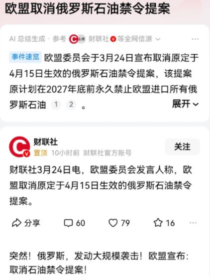 欧盟这是一点脸都不要了,说着最硬的话,挨着最狠的打! 欧盟委员会于当地时间3月24号对外宣布,取消掉原本定于4月15号生效的俄罗斯石油禁令。 俄乌冲突爆发后,欧盟便紧跟美方步伐推进对俄能源制裁,先后出台多项限制措施,大幅削减俄罗斯石油进口份额,到2025年第四季度,欧盟原油进口中俄罗斯货源占比已不足1%。 即便如此,欧盟仍未停下加码脚步,反复对外释放强硬信号,高层官员多次表态,称重回依赖俄罗斯能源的状态是战略失误,会让欧洲陷入更大安全隐患,执意推进全面禁运法案的落地筹备。 欧盟内部对于这份石油禁令的分歧,其实早已浮出水面,只是被统一的对外表态暂时掩盖,匈牙利、斯洛伐克等东欧国家始终持反对态度,这些国家能源结构单一,长期依赖俄罗斯管道油供给,禁令一旦落地,国内能源供应将直接断档,民众生活成本、企业生产成本会大幅飙升。 匈牙利总理多次公开反对相关制裁,直言过度制裁只会让欧洲民众买单,斯洛伐克也多次表达对能源安全的担忧,内部分歧始终难以调和。 外部局势的突变,更是成为压垮欧盟强硬立场的最后一根稻草。全球原油市场波动加剧,中东地缘冲突持续发酵,引发国际油价大幅飙升,欧洲能源供应本就处于紧绷状态,可再生能源尚无法完全填补传统能源缺口,企业开工、民众供暖都面临稳定供应压力。 与此同时,美国等盟友的能源支持并未达到预期,欧洲高价采购的液化天然气成本居高不下,国内制造业减产、民生负担加重的问题愈发突出。 欧盟原本以为,凭借自身的能源需求体量和国际话语权,推出全面石油禁令能重创俄罗斯能源经济,却忽略了俄罗斯早已完成能源出口转向,将大量原油销往亚洲市场,出口份额和财政收入并未出现大幅下滑。 反观欧盟,却要为强硬制裁付出沉重经济代价,国内通胀压力、民生抗议风险不断攀升,继续推进禁令无异于自我消耗,这也是欧盟最终选择叫停禁令的核心原因。 从高调造势、反复强调制裁决心,到突然取消禁令、悄然妥协,欧盟的一系列操作尽显被动。这场能源制裁博弈的反转,印证了单边制裁终究难以长久,脱离现实的强硬表态,最终都会被经济规律和民生需求打破。 欧盟此次叫停禁令,既是对当前局势的无奈妥协,也给全球能源市场传递出明确信号,地缘政治对抗无法解决实际问题,务实合作才是稳定市场、保障民生的核心路径。 那么,大家对欧盟取消俄罗斯石油禁令这一事件有何看法?欢迎在评论区留言交流。