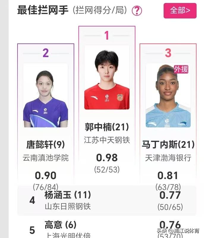 庄宇珊后来居上“紧咬”吴梦洁,江苏小将朱晋谊和郭中楠成为女排联赛最大“黑马”。截止目前,保级战豪砍42分的福建庄宇珊后来居上,在局均得分、局均进攻这两项技术榜单中,都已经完成“弯道超车”,仅次于江苏队长吴梦洁。值得一提的是,代表江西女排出战的江苏接应小将朱晋谊凭借出色发挥,在整个排超联赛所有接应球员中,综合能力排名第二,仅次于上海女排外援范赖克,这也意味着19岁的小将朱晋谊已是排超联赛本土接应NO.1。而江苏女排16岁副攻小将郭中楠在拦网局均得分榜单上,同样高居第一,这还是她拦网得分被连续漏掉统计的情况下完成的排名。毫无疑问,人才济济的江苏女排盛产“黑马”,朱晋谊、郭中楠、毛唯嘉、张籽萱都在本赛季闪闪发光,队长吴梦洁更是一枝独秀,可见江苏女排这几年的青训梯队建设非常扎实。