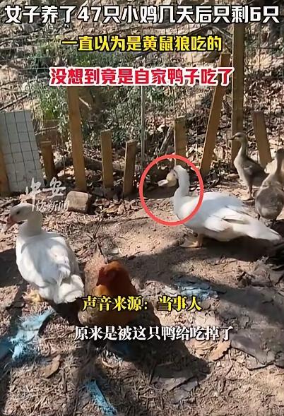 福建,一女子养了47只小鸡,几天后只剩6只,小鸡尸体都找不到,她一直以为是黄鼠狼吃的,结果有一天,她亲眼看到小鸡是被自家鸭子吃的,她十分纳闷:为什么鸭子会吃小鸡? 开春过后天气慢慢转暖,正是村院里养雏禽的好时节。 不少人家都会趁着这个时候抱一窝小鸡,图的是往后能有新鲜鸡蛋吃,养大了也能添点荤腥。 这位女子也是抱着这样的心思,特意去集市上挑了47只品相好、看着精神的雏鸡。 刚抱进家门的时候,这群小黄绒球叽叽喳喳闹个不停,脑袋一点一点地啄食碎米,模样软萌又讨喜。 可这份踏实日子没过几天,蹊跷事就找上门了。 头一晚睡前清点数量,她就发觉少了两只小鸡,心里先是一慌,随即又自我宽慰,觉得是小鸡太小,估计是它们钻到哪了而自己没有看到。 谁知道,这只是小鸡接连失踪的开端,往后几天,情况一天比一天糟,少的小鸡数量也越来越多。 有时候早上起来数,少三四只;有时候傍晚再看,一下子少七八只。 渐渐地从47只慢慢降到40只、35只、22只,前后不过几天功夫,最后等她再清点时,满院子就剩下6只小鸡缩在角落。 四十多只小鸡,短短几天就没了绝大多数,而且奇怪的是,她翻遍了整个院子,能找的地方全找遍了,始终没找到一具小鸡的尸体。 思来想去,女子觉得自家的鸡仔估计是被黄鼠狼给叼走了。 家里养的小鸡崽最容易招来天敌,其中最让人防不胜防的就是黄鼠狼。 老一辈人常说黄鼠狼偷鸡,动作麻利又隐蔽,往往叼着小鸡就走,现场很少留下痕迹,这和她遇到的情况几乎一模一样。 所以她才会一门心思认定,祸害小鸡的就是院子里溜进来的黄鼠狼。 那天阳光温温柔柔的,洒在院子里暖洋洋的,她搬着小凳子坐在门口择菜,手里忙着活计,眼神却时不时瞟向院子一旁的小鸡。 剩下的6只小鸡在空地上低头啄食,几只鸭子依旧在不远处慢悠悠地晃悠,一切都和往常没什么两样。 可就在她低头择菜的短短几秒钟,耳边突然传来一声极轻的雏鸡叫声,细弱又短促,刚响一声就戛然而止,不仔细听根本察觉不到。 她听到声响后瞬间抬头朝着小鸡的方向看过去,只见自家的鸭子,正叼着一只小鸡。 那只小鸡弱小得毫无反抗之力,连扑腾的机会都没有,鸭子只是微微仰头,脖子一伸一缩,几下就把整只小鸡吞进了肚里。 而地上依旧干干净净,没有血迹,没有鸡毛,半点作案的痕迹都没有。 女子站在原地,之前所有的疑惑、所有的排查、所有对黄鼠狼的防备,在这一刻全都有了答案,原来这么多天错怪了黄鼠狼,真正祸害小鸡的,竟是这群自己从未怀疑过的自家鸭子。 她从来没听过鸭子吃小鸡的事,只觉得匪夷所思,怎么也想不通。 这件事被发布到网络上后,网友们议论纷纷。 有网友说:“自己养鸭十几年,鸭子是杂食性,吃小鸡太正常不过了。” 还有网友提醒:“家禽混养一定要分年龄段、分品种隔离,千万别图省事。” (信息来源:2026-03-19 大河报《小鸡离奇失踪,47只剩6只!女主人怀疑过狗、黄鼠狼、老鼠,“凶手”让其傻眼:万万没想到》)