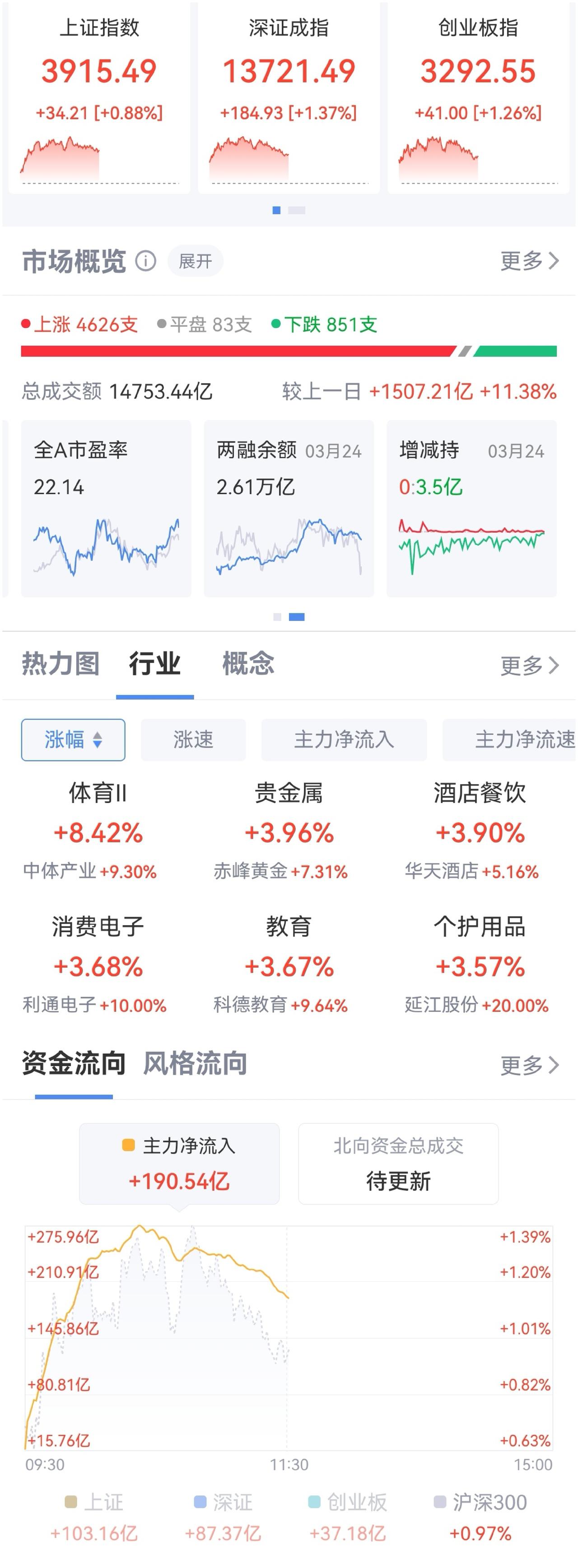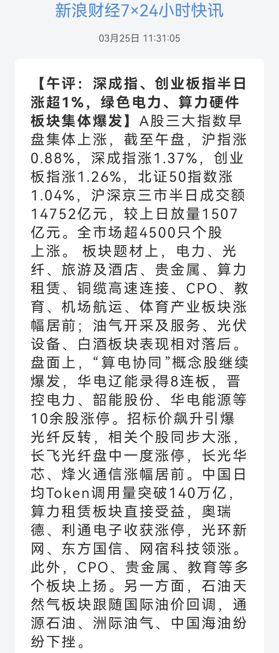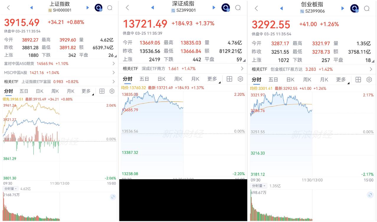 午盘印象(3月25日) 反弹又谨慎 分歧中等待 外围:市场不信任 美股调整 科技分化 内股:AI硬件领军科技 冲高回落 一、三大股指开涨: 个股开盘涨平跌比率68%:12%:20%。 个股开盘极强势(+49 Vs +92个百分点), 个股高开不足七成,观望增加 二、早盘指数分化 半日1.47万亿 震荡上扬或冲高回落 三、涨跌幅榜: 科技反弹 红利震荡 非银红盘 跌幅前列:化石能源、化工、光伏、电池 涨幅前列:金属类、消费、电力 四、开盘和午盘: 开盘:沪+0.28%、深+0.98%、创+1.10%。 午盘:沪+0.88%、深+1.37%、创+1.26%。 上证上扬 深市震荡 五、午盘个股上涨83%,与昨日涨跌差距( +68 Vs +68个百分点),个股反弹中 相比开盘,涨跌差回落,上涨股小幅增加 资金+191 ( -66)亿,资金谨慎流入 六、沪深两市成交量午盘14,669亿,上个交易日13,164亿,同比量能扩张超1,500亿 七、指数个股反弹中,观望情绪升温 两融连续4天净减少 -43 -174 -115 -69亿,指数反弹高度受限 早盘指数分化,AI硬件带领冲高回落,与开盘相比,上证涨幅扩大,深小创继续受储能等补跌影响,几乎走平;资金面也冲高回落,静等谈判消息明朗 虽分歧巨大,但谈判一定会成行,成果还要看特朗普是否急于抽身。 午后两种情形: 1、横盘震荡:战事缓和未确认,分歧严重,平行震荡,时间换空间。 2、震荡回升:跌幅已深,反弹修复,缓和偏乐观,大开大阖,慢牛格局未变。 (图片源自网络侵权告知删除)