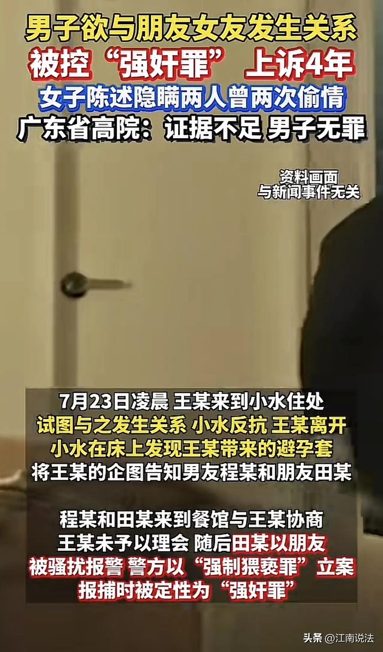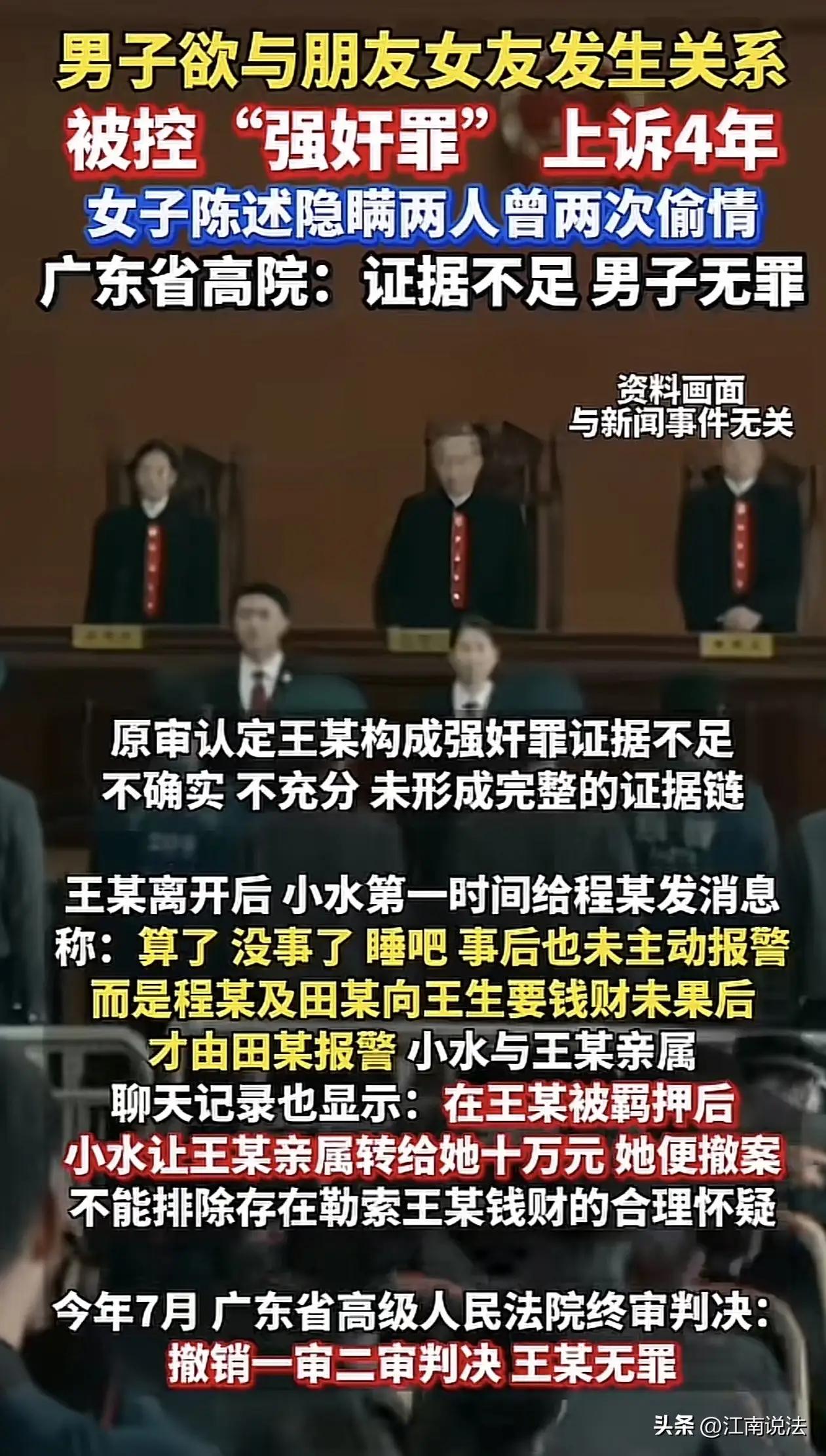 太炸裂!广东惊现一出全员“参演”的狗血反转剧,短短几天,舆论彻底炸锅! 故事的主角叫王生,本是一名普通厨师,却因为认识了朋友的女友,人生一夜之间跌入谷底。两人私下暧昧,曾自愿发生两次关系,可当王生第三次登门求欢被拒后,一场精心布局的“陷阱”就此铺开。 朋友发现了王生遗留的避孕套,随即报警,并一口咬定是强奸。更讽刺的是,当时陪同的朋友田某,竟冒充小水的“表哥”,索要3000元赔偿未果后才报警,而报警理由仅仅是“骚扰”。 然而,令人脊背发凉的是,这个看似板上钉钉的“强奸案”,从一开始就疑点重重。 一审、二审,王生均因“强奸罪”被判入狱10个月。他不服,一路申诉,官司打了整整四年。直到广东省高院再审,才抛出这个让所有人都没想到的结局——改判无罪! 高院的判决,字字诛心,直接戳破了这场闹剧的本质:仅有女方单方面陈述,且隐瞒了前两次自愿发生关系的关键事实,证据链根本无法形成完整闭环。 更耐人寻味的细节还在后头:案发后,小水给男友发的微信是“算了,没事了”,显然没有主动报警的意图;甚至在王生被羁押后,小水还曾联系其亲属,开口索要10万元才肯撤案! 这哪里是受害者?这分明是一场披着“正义”外衣,夹杂着私情、算计甚至潜在勒索的闹剧。 法律的底线在于疑罪从无。高院的改判,不仅是还王生一个清白,更是给所有人敲响了警钟:在两性关系中,不能仅凭事后陈述就定罪,更不能因为所谓的“朋友妻不可欺”就道德绑架,任由情绪凌驾于证据之上。 这场四年的拉锯战,代价是10个月的牢狱之灾和人生的重创。但好在,正义虽然迟到,终究没有缺席。 这件事看完,你细品一下:如果前两次关系不被隐瞒,如果没有那10万的索求,一个普通男人是不是就毁了?这起案件的判决,其实守护的是每一个普通人不被随意定罪的权利。 来,评论区聊聊,你怎么看这起反转案?你觉得真相到底是什么?生活总爱反转剧 情景反转剧 你身边有没有感人至深的爱情故事!
