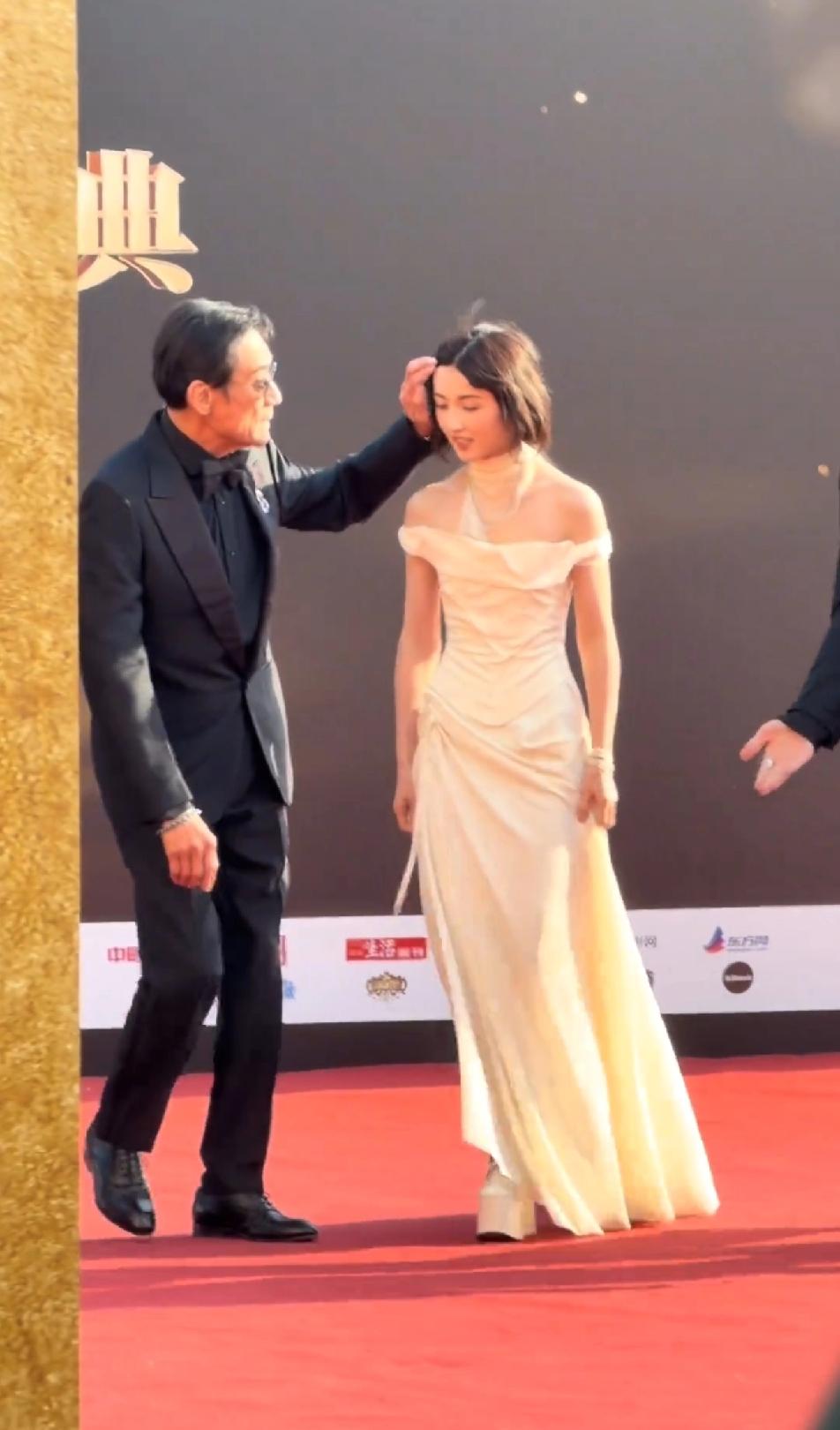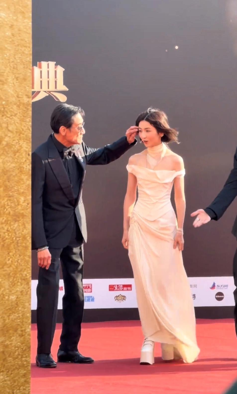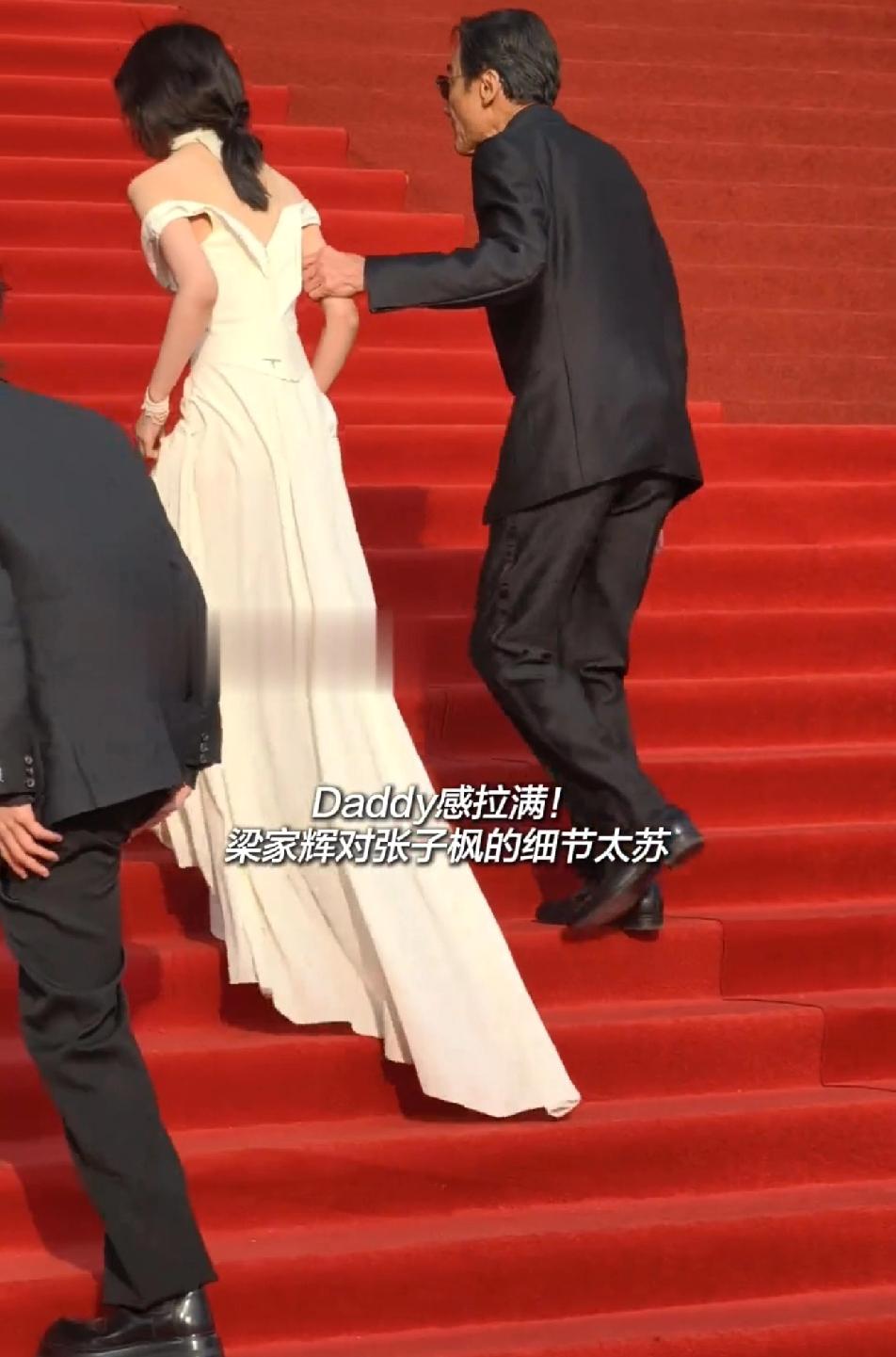 最好的梁家辉!张子枫好幸运也好幸福,辉叔真的拿她当自己的娃儿一样照顾,走红毯前帮忙整理头发,整理裙摆,上楼梯时一把抓住张子枫的手臂扶着她,生怕穿了超级恨天高的子枫妹妹摔跤!不止对张子枫,辉叔对谁都一样慈爱,不经意的帮辛芷蕾提起披肩挡住脖子的一个动作,好暖也好有“爹味”!辉叔是且骨子里的绅士,慈爱,风度翩翩!跟他合作演戏或者做任何工作都是一种幸运和幸福!
