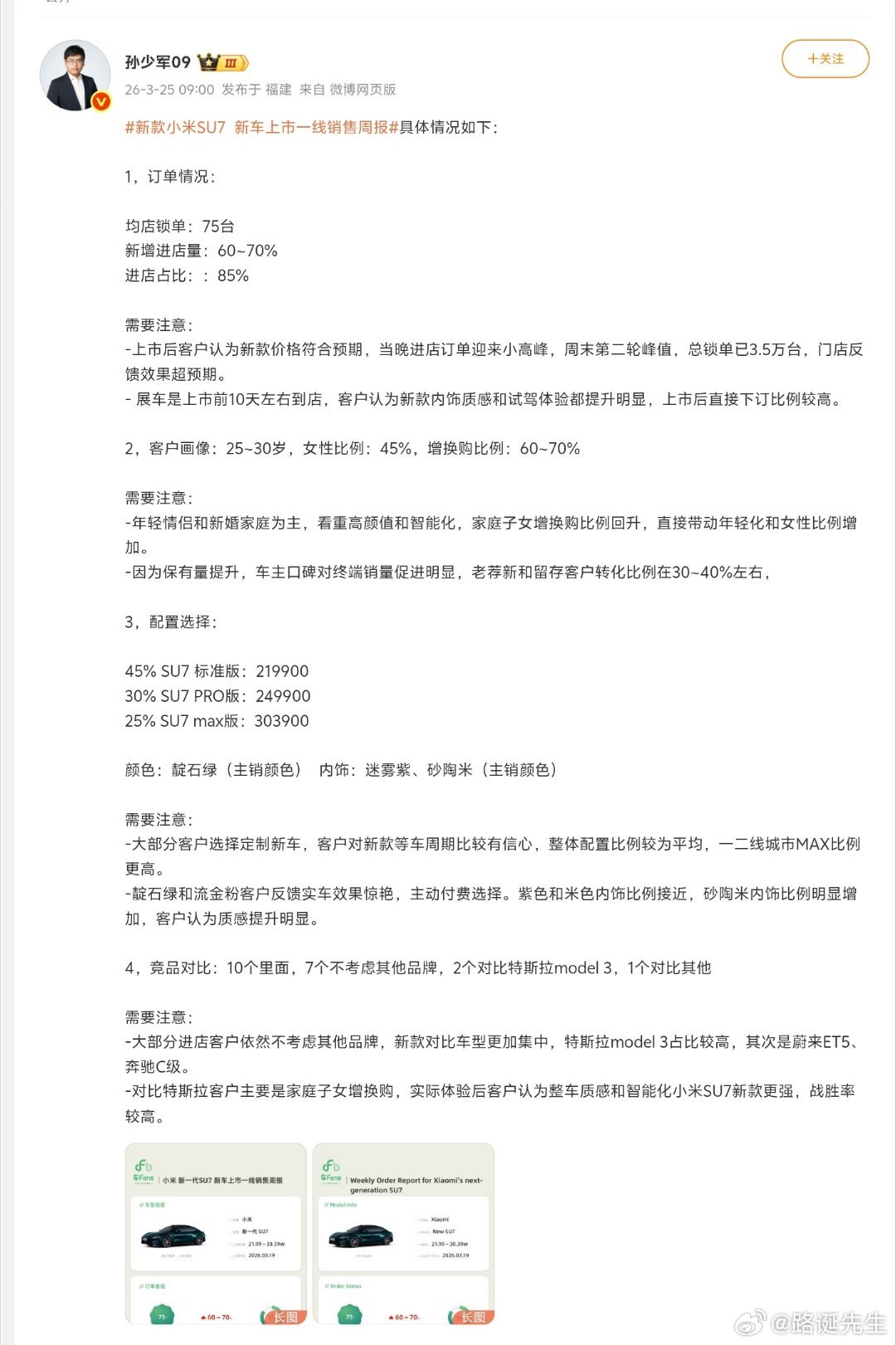 小米新SU7销售周报小米新SU7无论从锁单数据、门店数据来看,产品依然火爆。10个里面,7个不考虑其他品牌,其中只有两个会对比特斯拉model 3,这用户忠诚度非常高。同时可以看出,小米新SU7,依然是特斯拉的强劲对手。上一代就和model 3打得有来有回,这一代还会势均力敌。