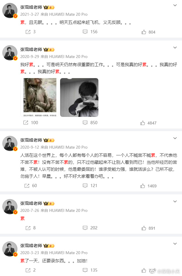 张雪峰语录:累翻看张雪峰的微博,说得最多的就是“累”。作为下岗工人家庭的孩子,80后的张雪峰还能通过挤高考这条独木桥实现跨升。但他也知道自己不像别人一样有“三代积累”“出生就在罗马”,所以只能不断燃烧生命,比世家子弟们更拼命的干活,最终不幸发生了……