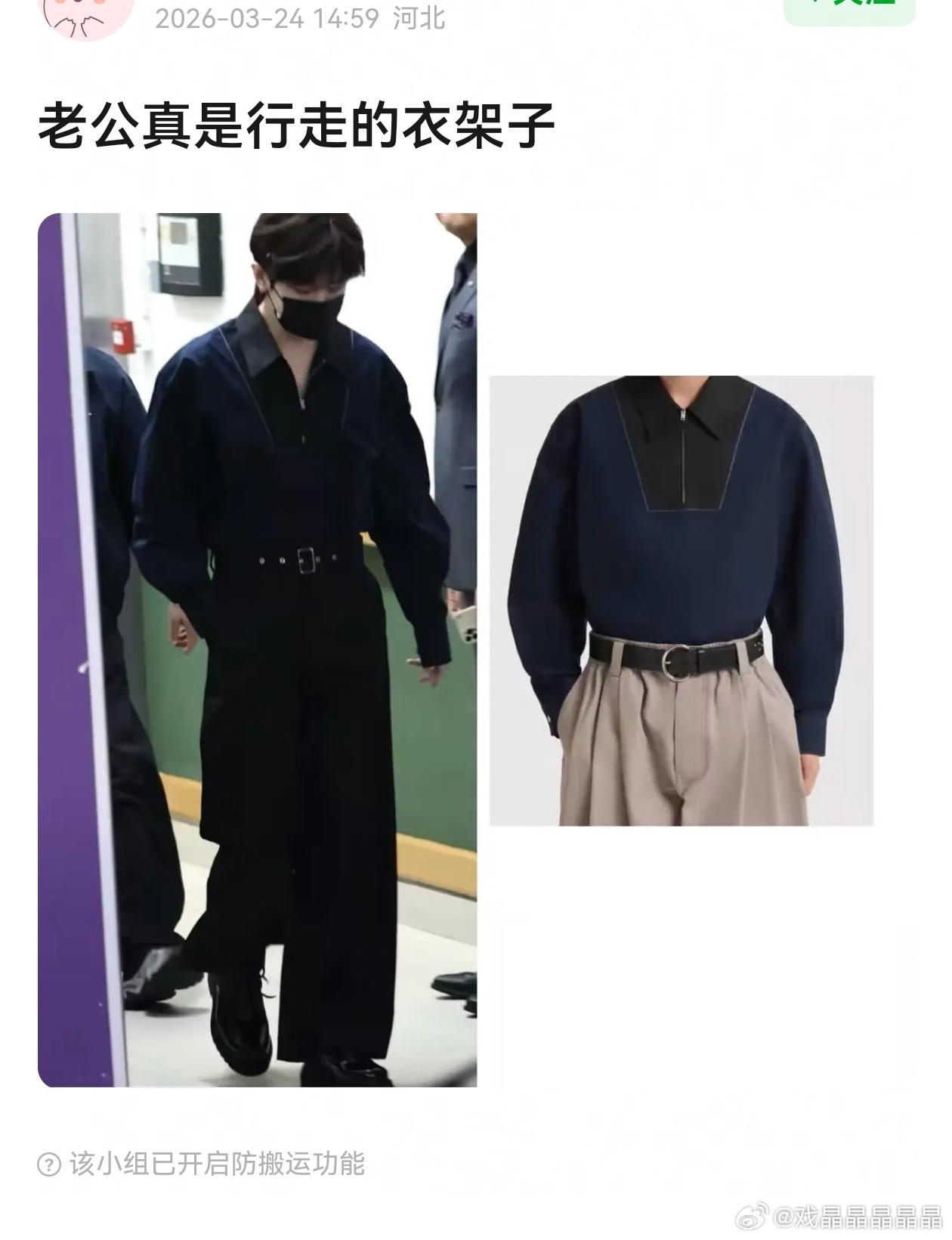 们iejj真的不挑,这都能叫行走的衣架子造型师巧妇难为无米之炊。为了遮住窄肩,造型师给他穿了落肩款的衣服,他没胯,造型师为了固定住裤子,给他挑了皮带款的裤子,这真的是大爷造型。